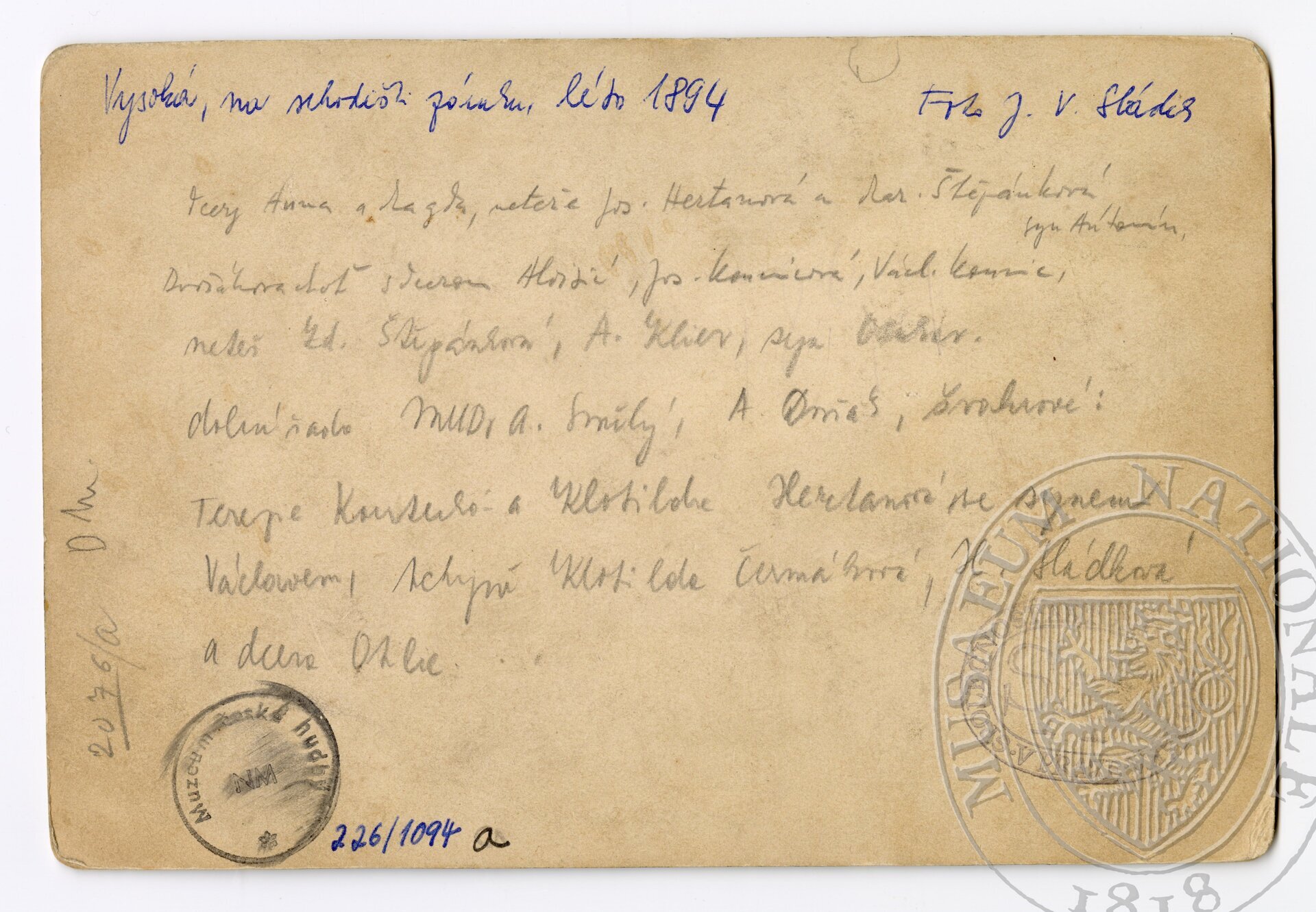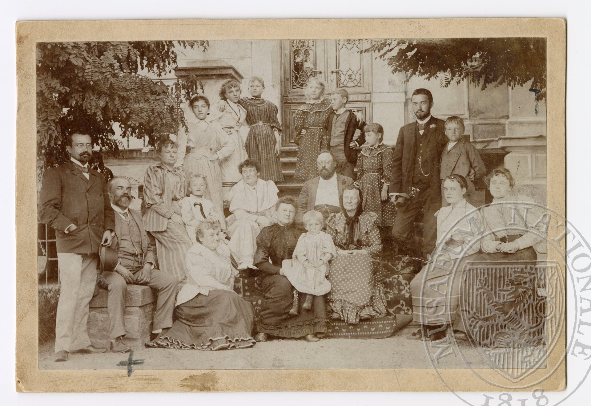 Antonín Dvořák s rodinou a přáteli na schodech zámečku svého švagra hraběte Václava Kounice a jeho manželky Josefíny na Vysoké u Příbramě. Zleva: rodinný přítel MUDr. Smělý, vedle něj A. Dvořák, v proužkovaných šatech Anna Dvořáková, před ní nejmladší dcera Aloisie, za ní dcery Anna a Magda, vedle v tmavých šatech neteře Jos. Hertanová a Mar. Štěpánková, vedle ní syn Antonín. Uprostřed v bílých šatech švagrová Josefína Kounicová, vedle její manžel hrabě Václav Kounic, neteř Z. Štěpánková, A. Klier a syn Otakar. Dolní řada zleva: švagrové Terezie Koutecká a Klotilda Hertanová se synem Václavem, tchyně Klotilda Čermáková, H. Sládková a dcera Otilie.