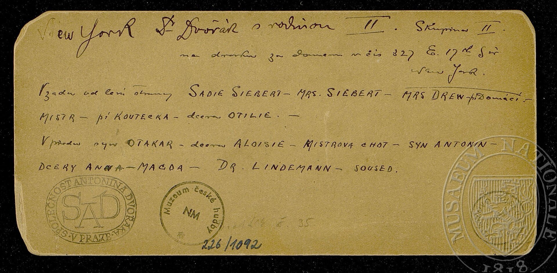 Na reversu perem přípis Josefa Jana Kovaříka: „New York Dr. Dvořák s rodinou II. Skupina II. na dvorku za domem v čís 327 E. 17th Str. New York. Vzadu od levé strany Sadie Siebert - Mrs. Siebert - Mrs. Drew-pí domácí. - Mistr - pí Koutecka - dcera Otilie. - Vpředu syn Otakar - dcera Aloisie - Mistrova chot - syn Antonin - dcery Anna - Magda, Dr. Lindemann-soused. “ Na reversu tužkou: „Bachtík č. 35“