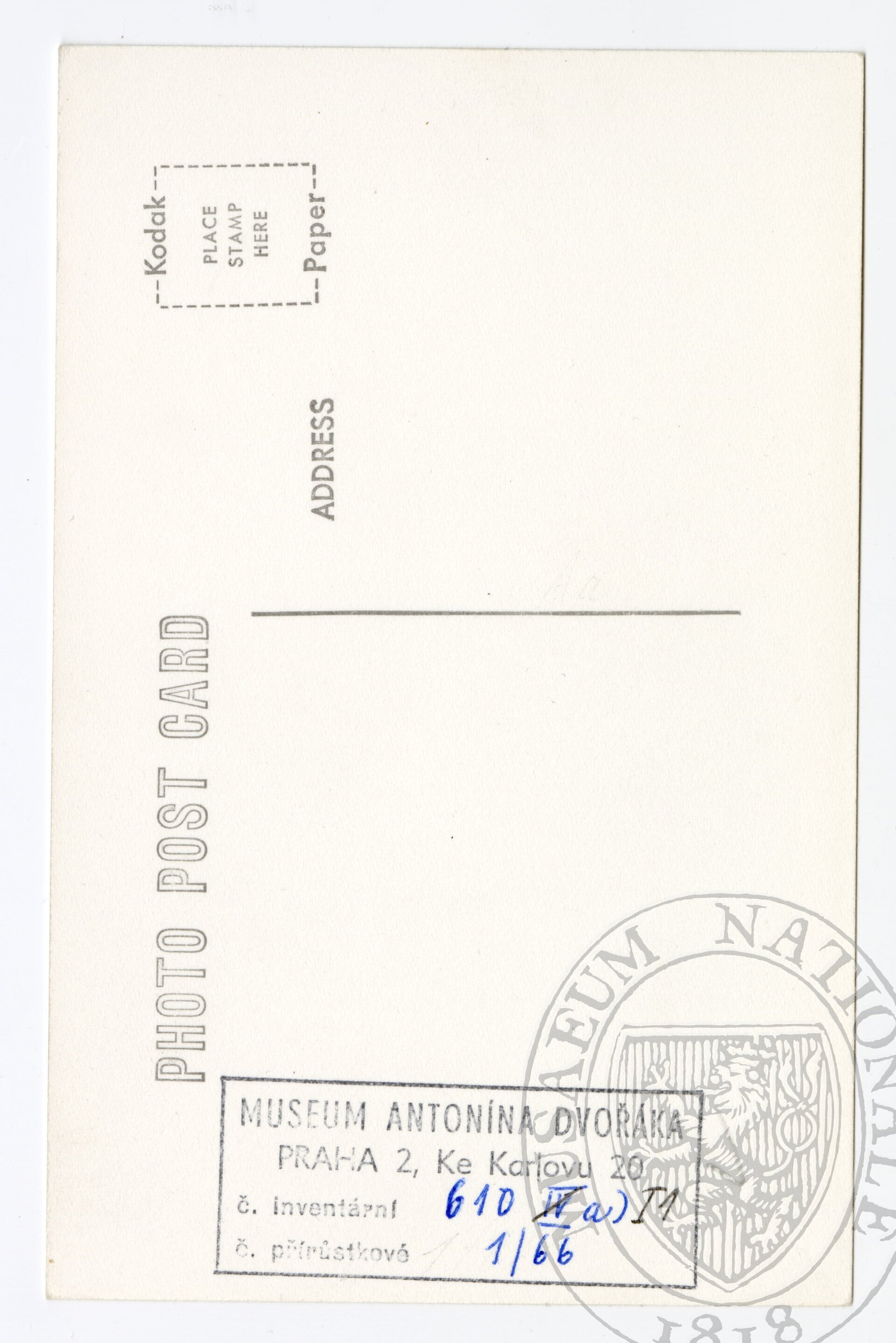 Fotopohlednice s portrétem Antonína Dvořáka. Plnovous, vlasy sčesány dozadu. Tmavý oblek s tmavou vestou, bílou košilí, tmavým plastronem se vzorem podkoviček a s ozdobnou jehlicí.