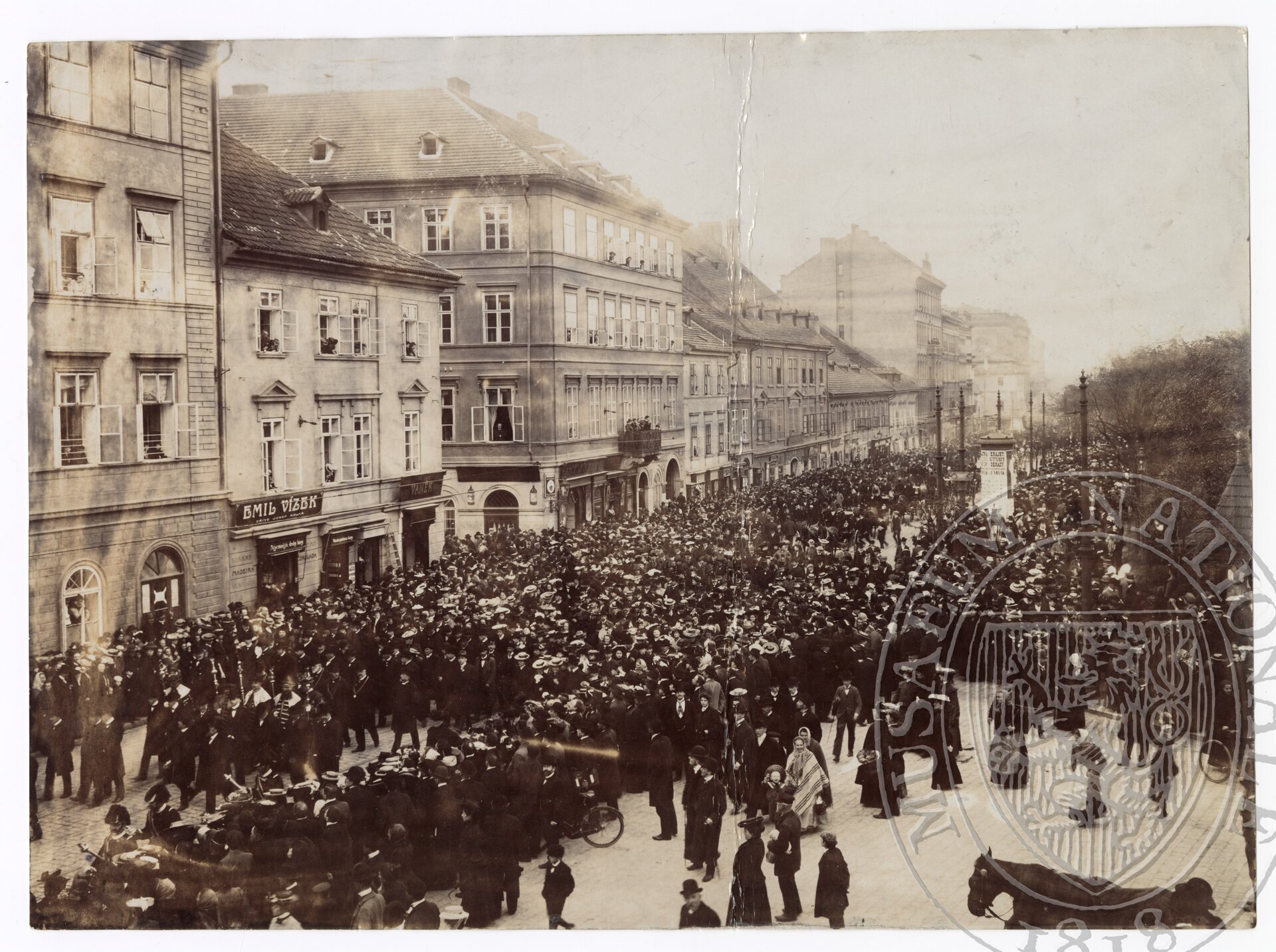 Pohřební průvod Antonína Dvořáka v jihozápadní části Karlova náměstí. V popředí představitelé univerzity.