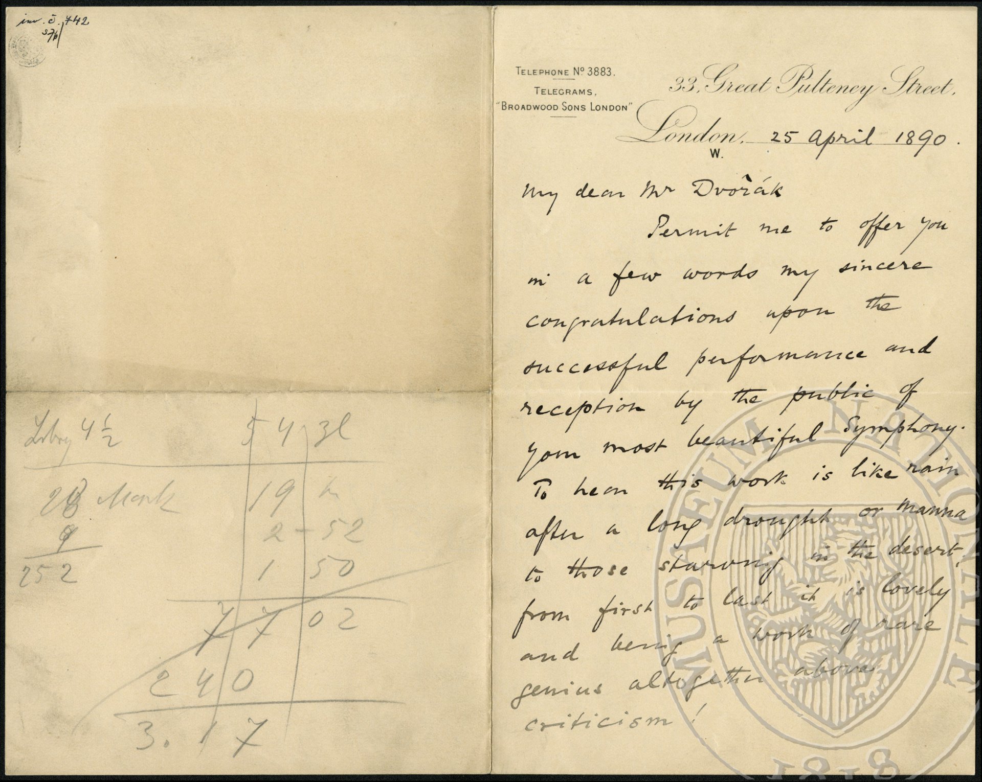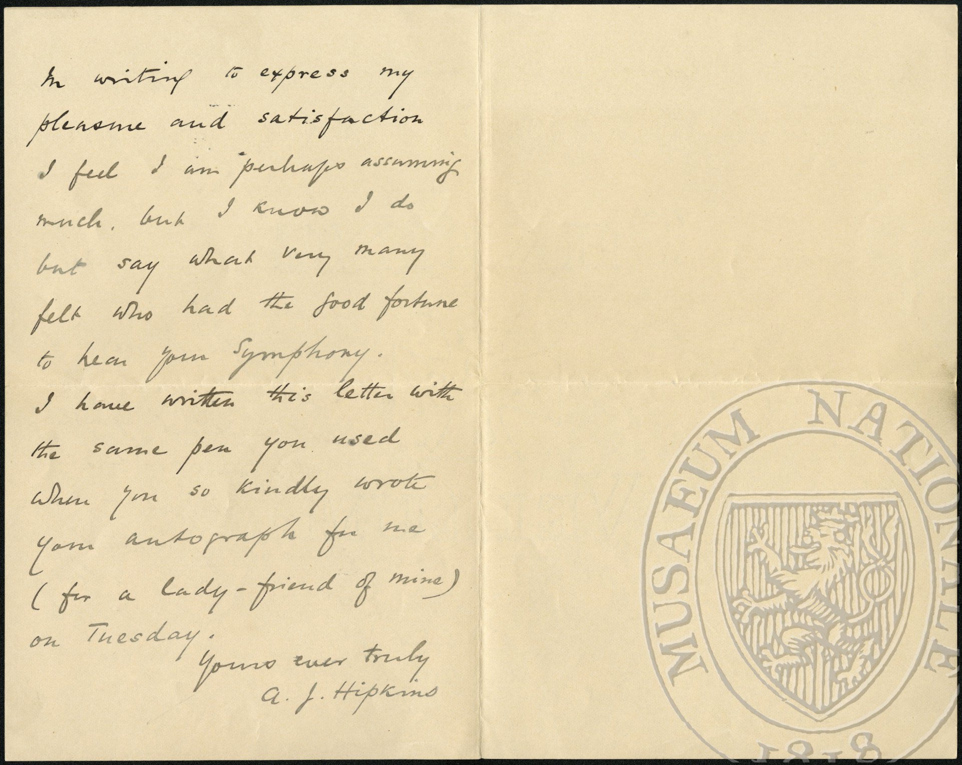 Permit me to offer you in a few words my sincere congratulations upon the successful performance and reception by the public of your most beautiful symphony. To hear this work is like rain after a long drought or manna to those starving in the desert; from first to last it is lovely and begin a work of rare genius altogether above criticism! In writing to express my pleasure and satisfaction I feel I am perhaps assuming much, but I know I do but say what very many felt who had the good fortune to hear your symphony. I have written this letter with the same pen you used when you so kindly wrote your autograph for me (for a lady-friend of mine) on Tuesday.