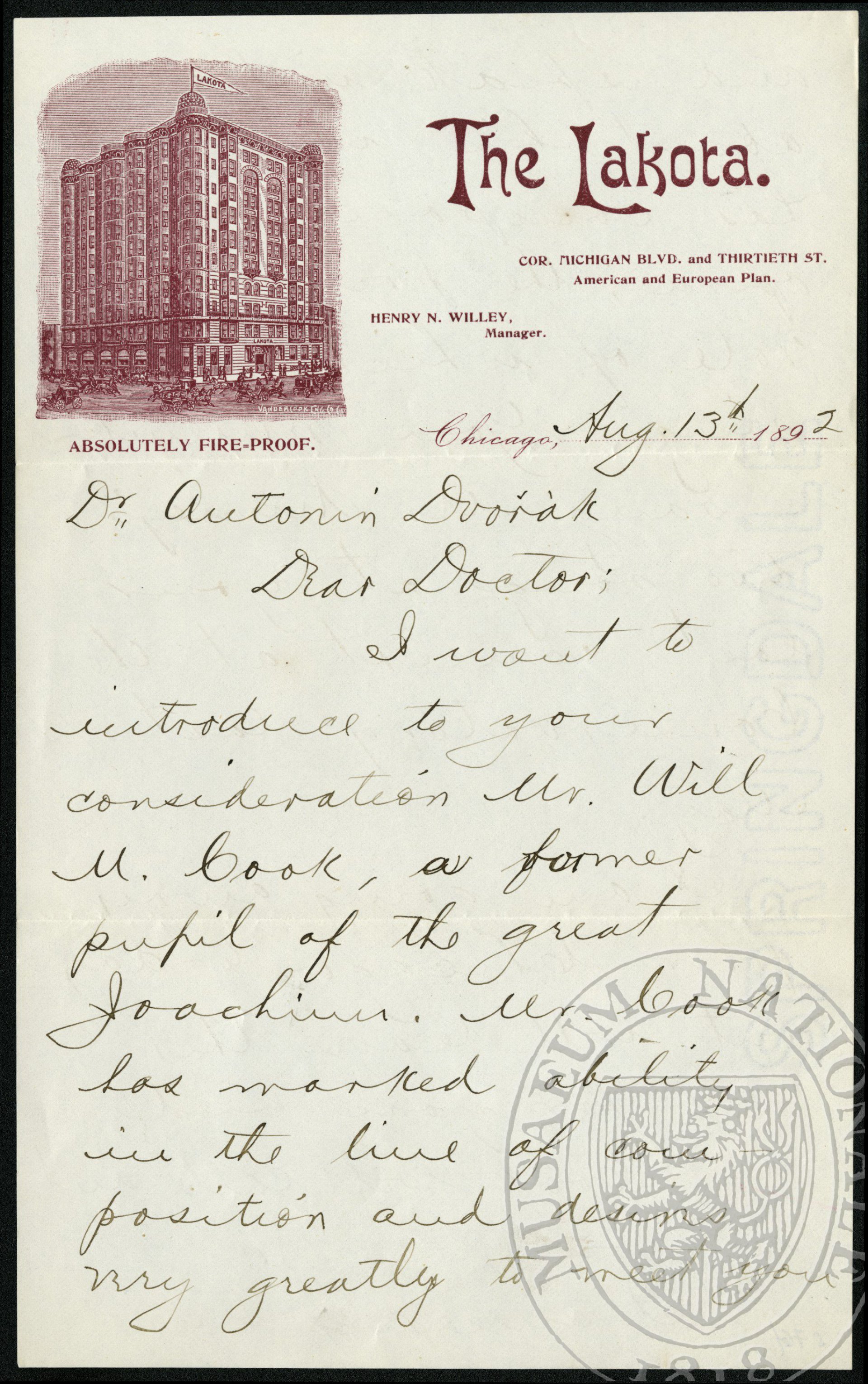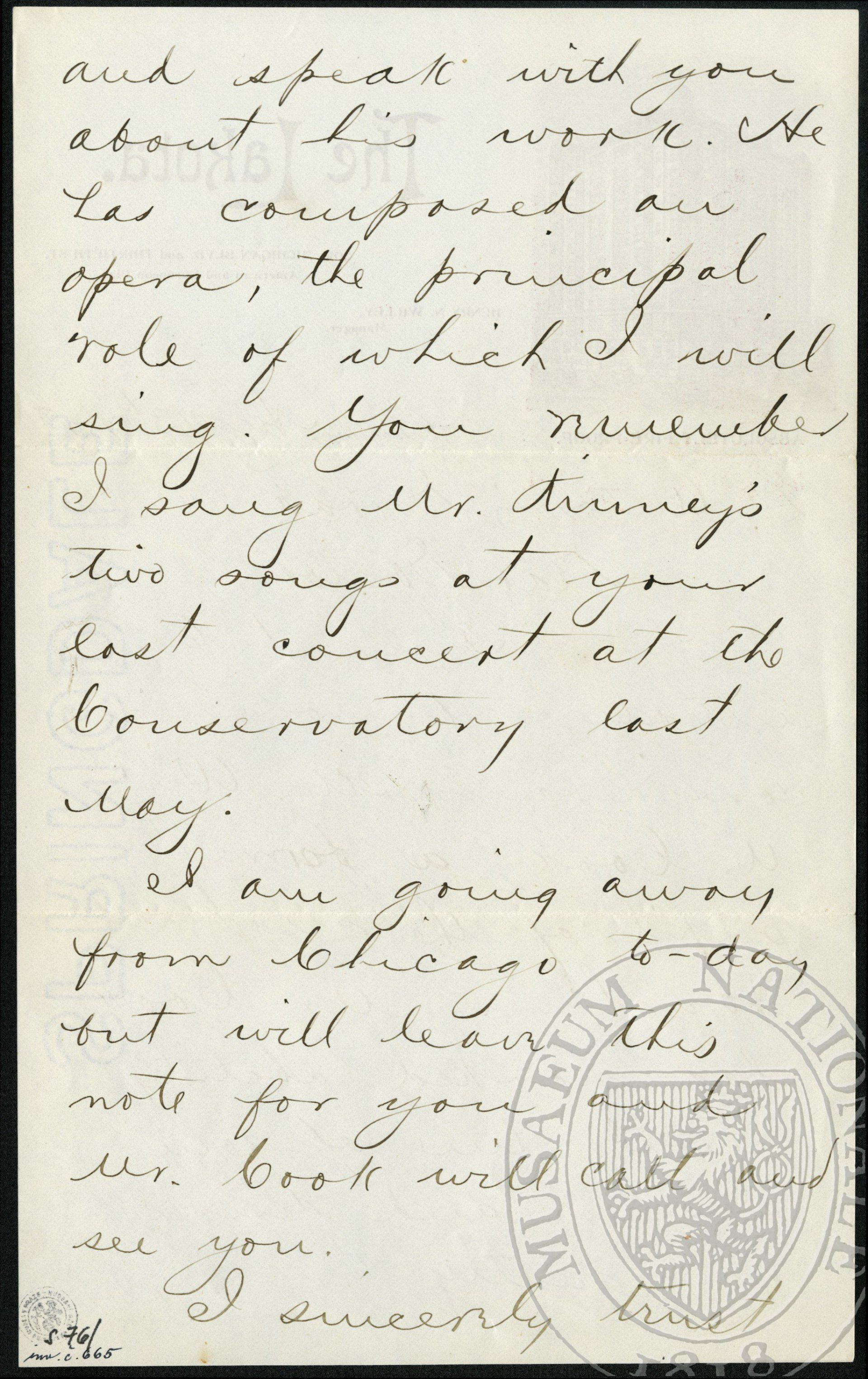 I want to introduce to your consideration Mr. Will M. Book, a former pupil of the great Joachim. Mr. Book has marked ability in the line of composition and desires very greatly to meet you and speak with you about his work. He has composed an opera, the principal role of which I will sing. You remember I sand Mr. Trinney’s two songs at your last concert at the Conservatory last May.
