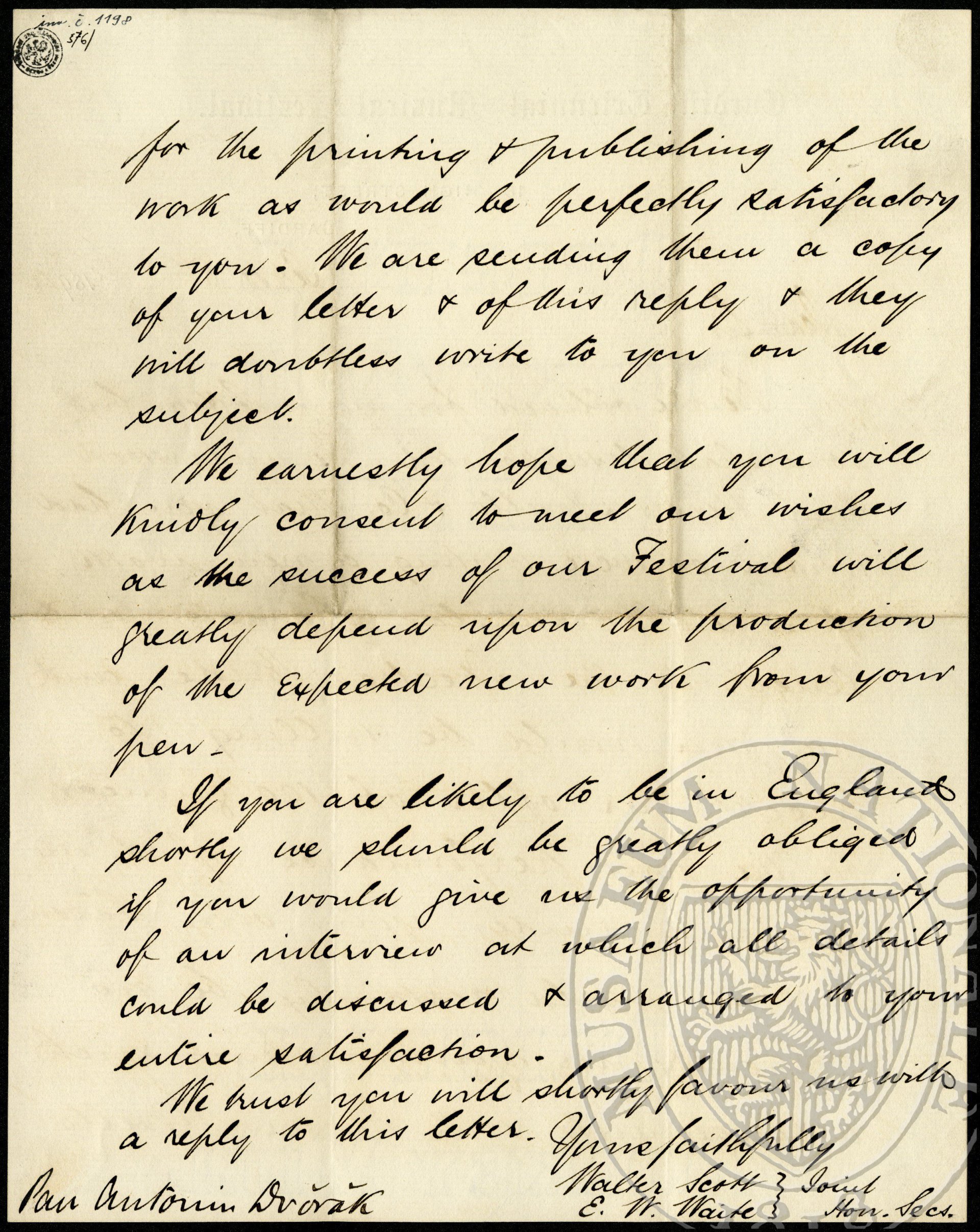We are obliged for your letter but somewhat disappointed. We understood from Messrs Novello + Co. What you had written or were writing a new work of somewhat similar character and length to the “Spectre’s Bride” and that would be willing to accept our offer of 100 guineas for the first performance of it in England under your own baton.