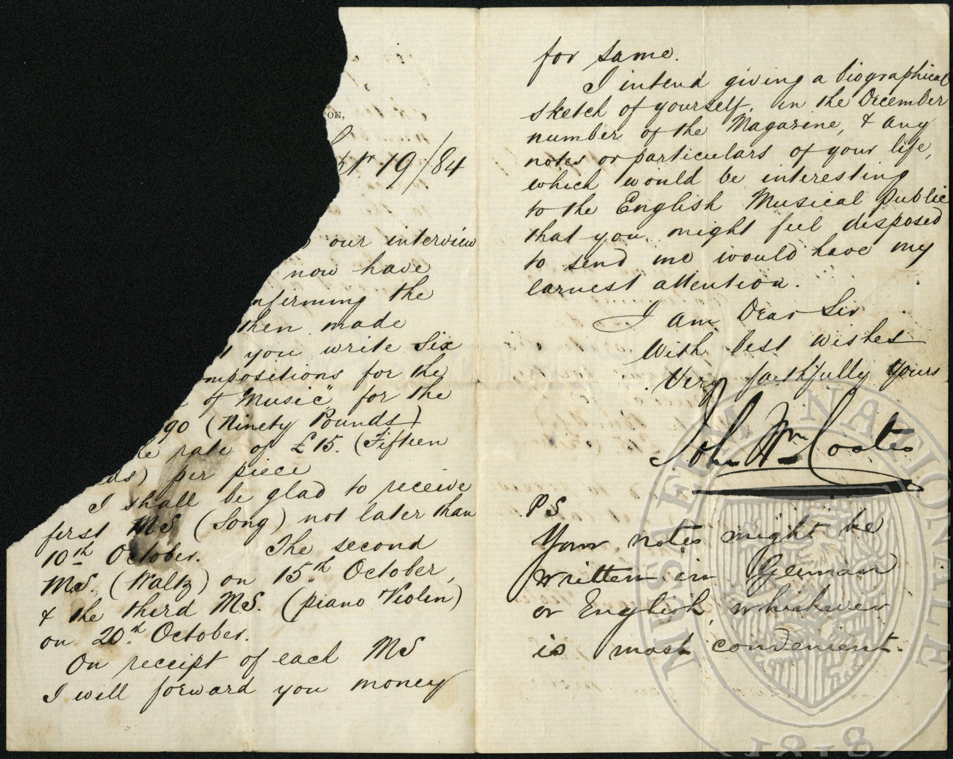 … our interview… now have.. confirming the… then made… you write six… compositions for the… of Music” for the… go (Ninety Pounds) … pate of £15 (Fifteen pounds) per piece.