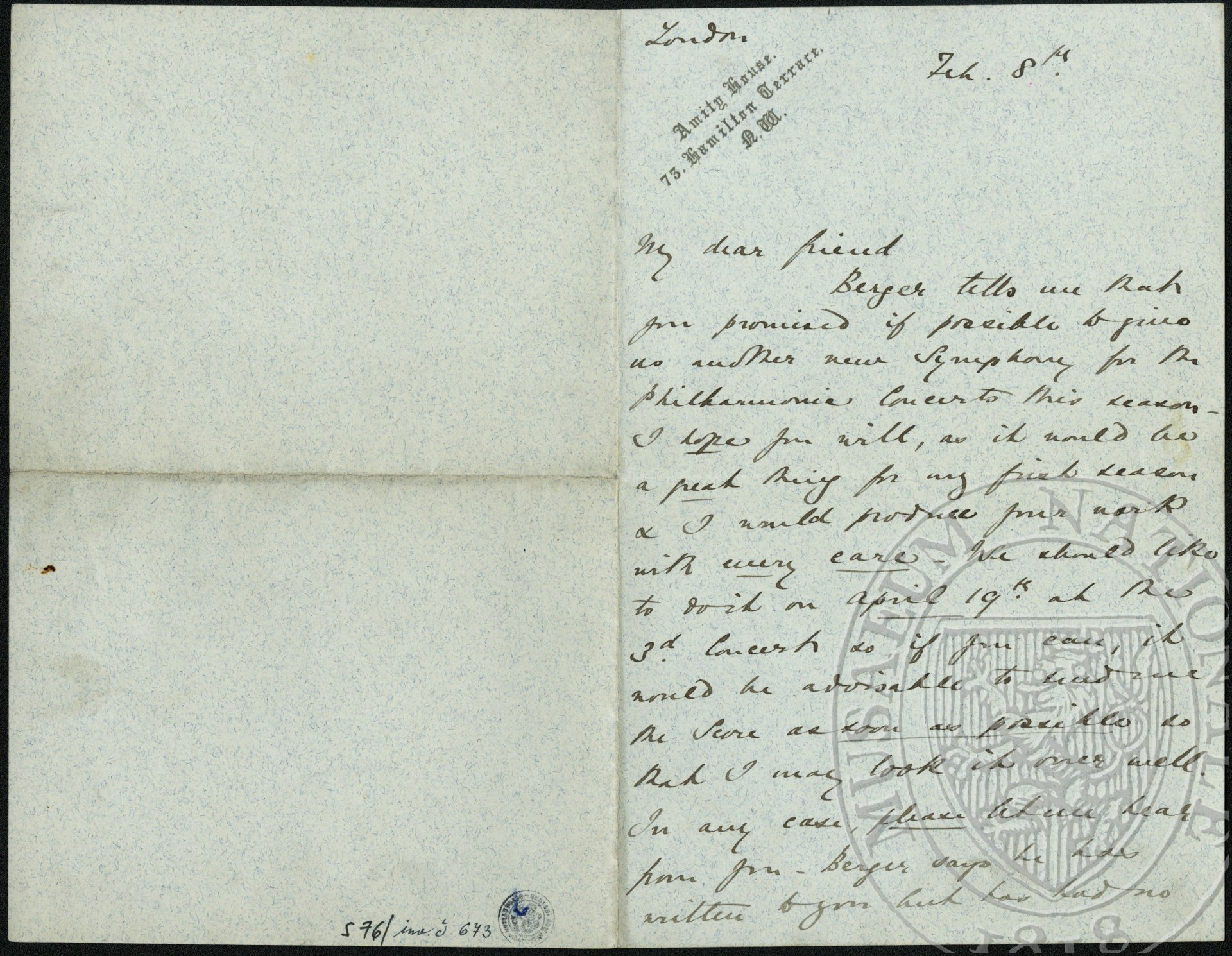 Berger tells me that you promised if possible to give us another new Symphony for the Philharmonic concerts this season. I hope you will, as it would be a great thing for my first season + I would produce your work with every care. We should like to do it on April 19th at the 3rd concert so, if you can, it would be advisable to send me the score as soon as possible so that I may look it over well. In any case, please let me hear from you. Berger says he has written to you but has had no answer. Hoping you are well and that we may be able to announce a new work from your pen.