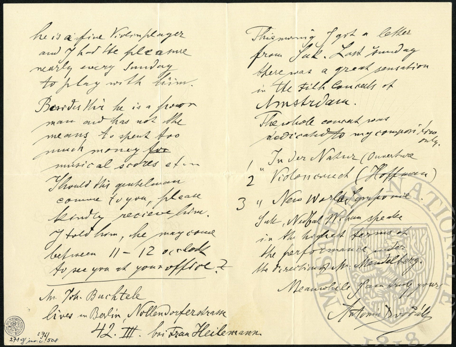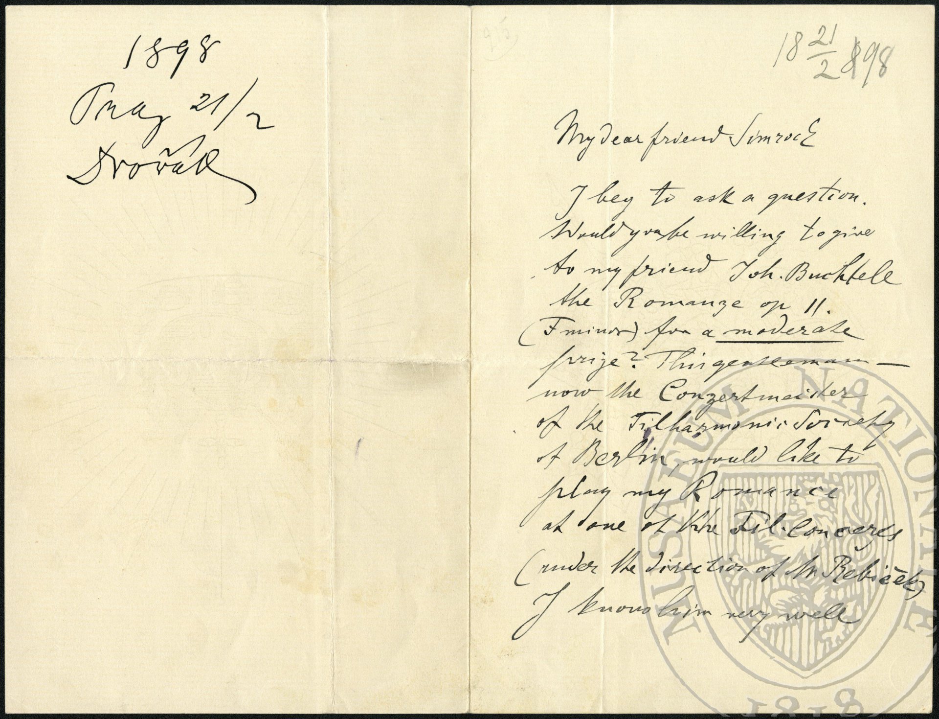 My dear friend Simrock I beg to ask a question. Would you be willing to give to my friend Joh[annes] Buchtele the Romanze op.11. (F minor) for a moderate prize[!]1 ? This gentleman - now the Conzertmeister of the Filharmonic Society of Berlin, would like to play my Romance at one of the Fil[harmonic] concerts (under the direction of Mr Rebíček) I know him very well. He is a fine violin player and I had the pleasure nearly every Sunday to play with him.