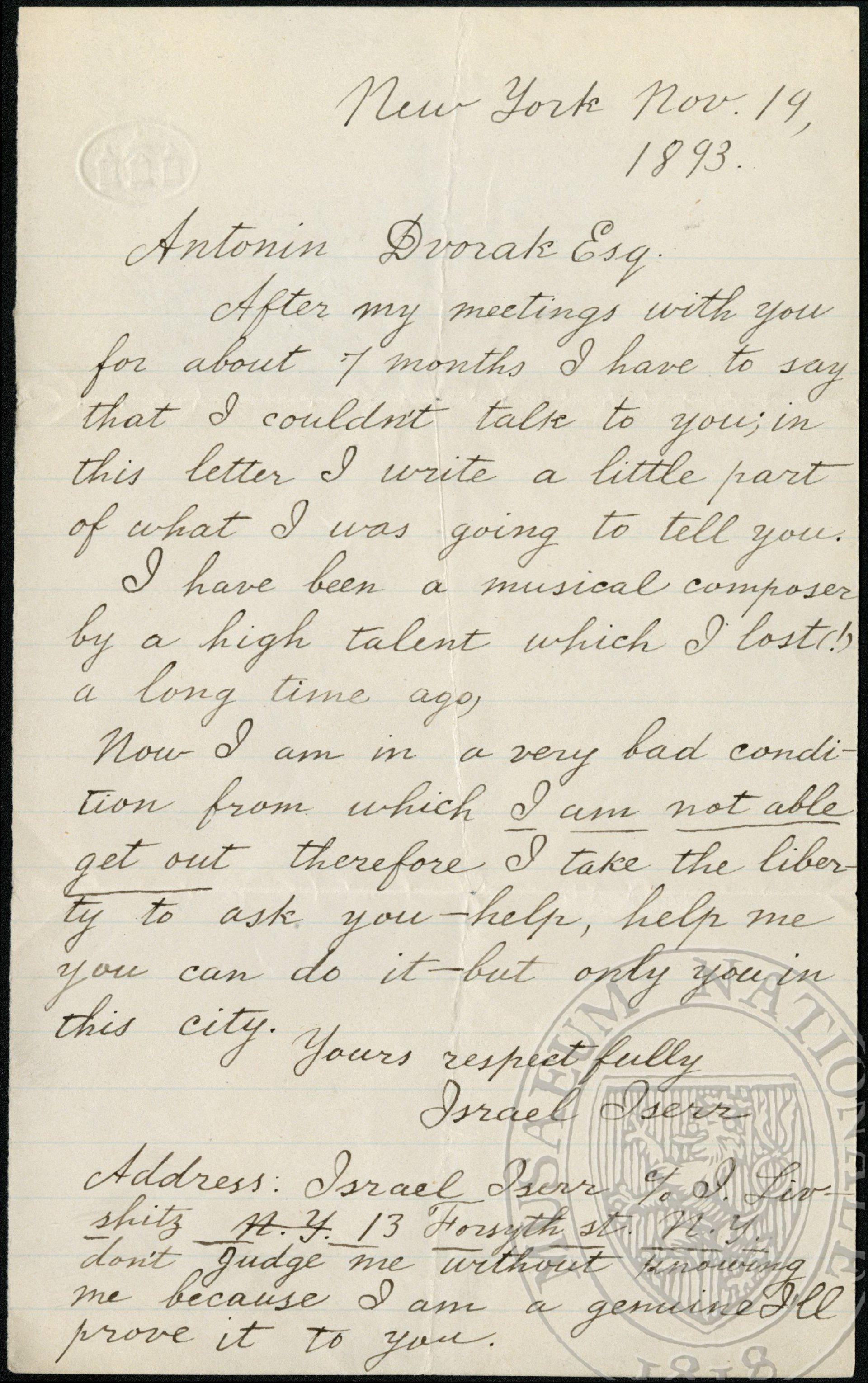 Address: Israel Iserr ℅ I. Livshitz N.Y. 13 Forsyth St. N.Y. don’t judge me without knowing me because I am a genuine. I’ll prove it to you.