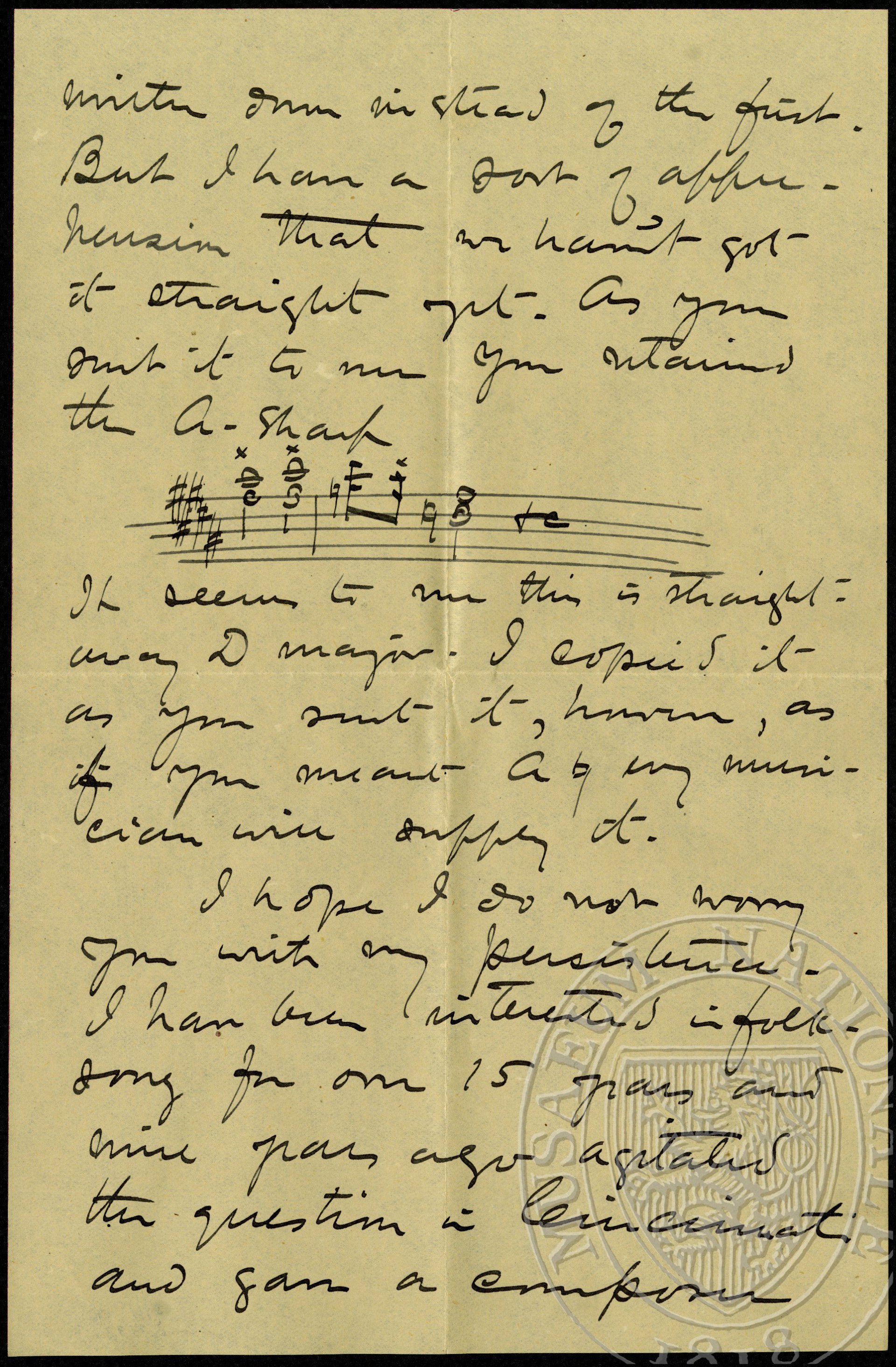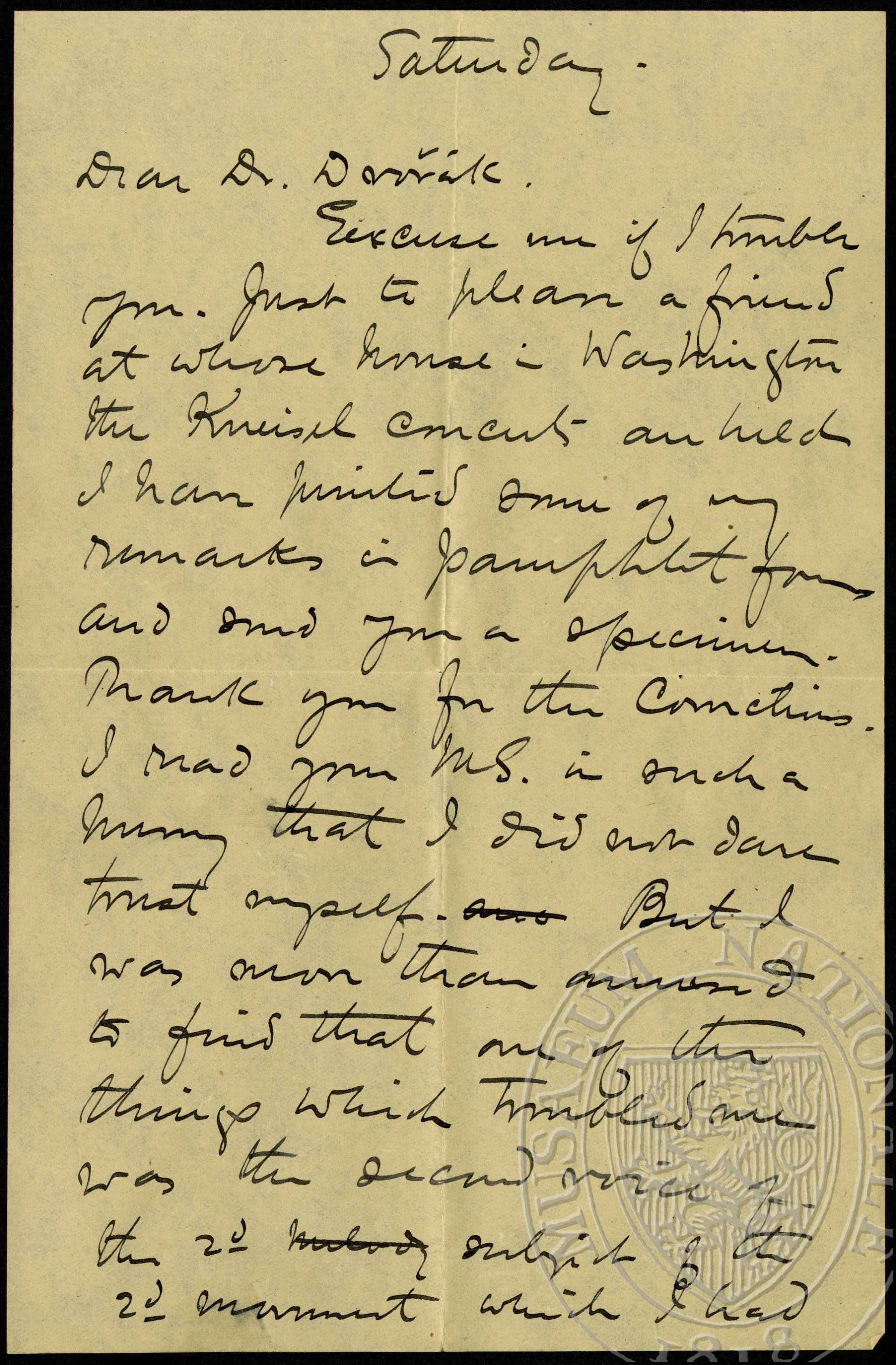 Saturday Dear Dr. Dvořák Excuse me if I trouble you. Just to please a friend at whose house in Washington the Kneisel concerts are held I have printed some of my remarks in pamphlet form and send you a specimen. Thank you for the corrections. I read your M[anu]S[cript] in such a hurry that I did not dare trust myself. But I was more than amused to find that one of the things which troubled me was the second voice of the 2nd melody subject of the 2nd movement which I had written down instead of the first. But I have a sort of apprehension that we haven’t got it straight yet. As you sent it to me your sustained the A-sharp [notová ukázka] It seems to me this is straight away D major. I copied it as you sent it, however, as if you meant A♮ musician will supply it. I hope I do not worry you with my persistence. I have been interested in folk-song for over 15 years and since years ago agitated the question in Cincinnati and gave a composer some melodies for a sute suite which was played at a reception given to me. Cincinnati I want to get our musicians aroused. Next Monday evening I shall lecture on the subject before Brown University in Providence. Very sincerely yours H.E.Krehbiel