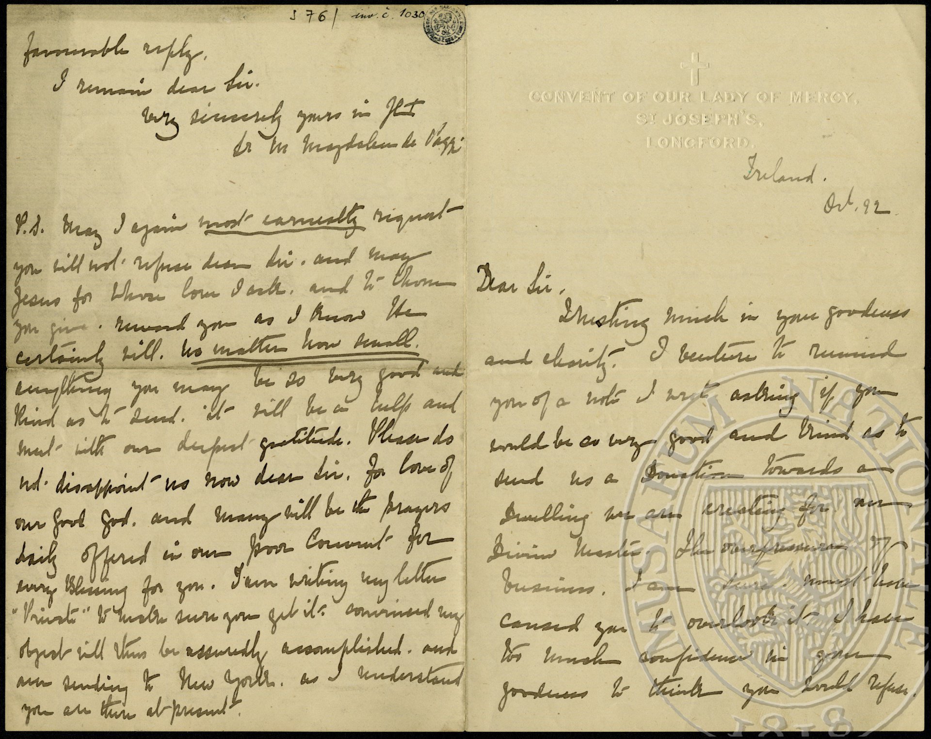 P.S. May I again most earnestly request you will not refuse dear Sir, and may Jesus for whose love I ask, and to whom you give, reward you as I know He certainly will, no matter how small, everything you may be so very good and kind as to send, it will be a [?] and [?] with our deepest gratitude. Please do not disappoint us now dear Sir. For love of our Good God, and many will be the prayers daily offered in our poor Convent for every blessing for you. I am writing my letter "[?]” to make sure you get it. Convinced my object will thus be assuredly accomplished, and our sending to New York, as I understand you are there at present.