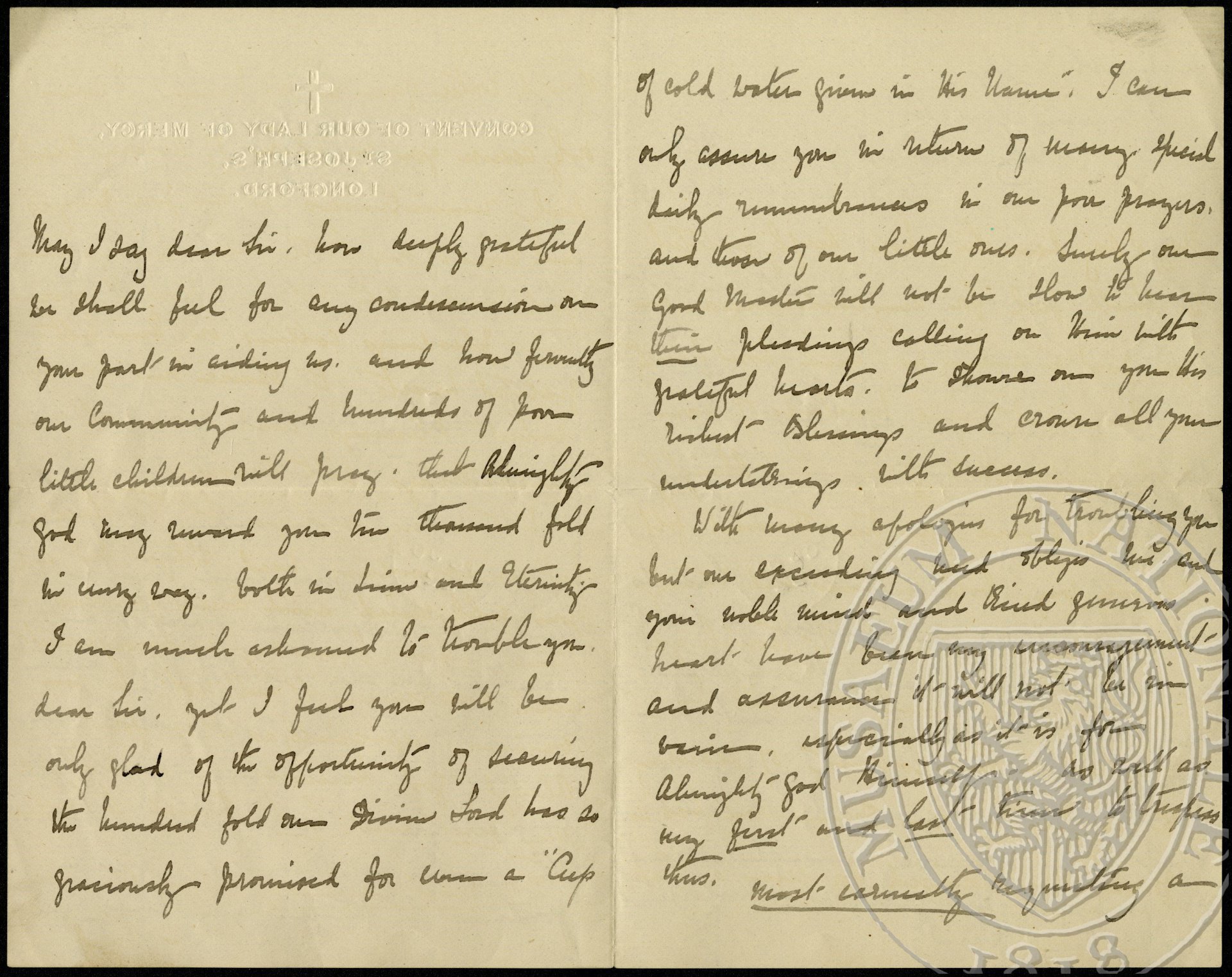 Trusting much in your goodness and charity. I [?] to remind you of a note I wrote asking if you would be so very good and kind as to send us a donation towards a dwelling we are creating for our Divine Master. The overpressure of business, I am sure, must have caused you to overlook it. I have too much confidence in your goodness to think you could refuse. May I say dear Sir, how deeply grateful we shall feel for any [contribution?] on your part in aiding us and how fervently our community and hundreds of poor little children will pray, that Almighty God may reward your two thousand fold in every way, both in time and eternity. I am much ashamed to trouble you, dear Sir, yet I feel you will be only glad of the opportunity of securing the hundred fold our Divine Lord has so graciously promised for even a “Cup of cold water given in His Name”. I can only assure you in return of many special daily remembrances in our poor prayers, and [?] of our little ones. Surely our Good Master will not be slow to hear their pleadings calling on Him with grateful hearts, to shower on you His [?] blessings and crown all your [understandings?], with success.