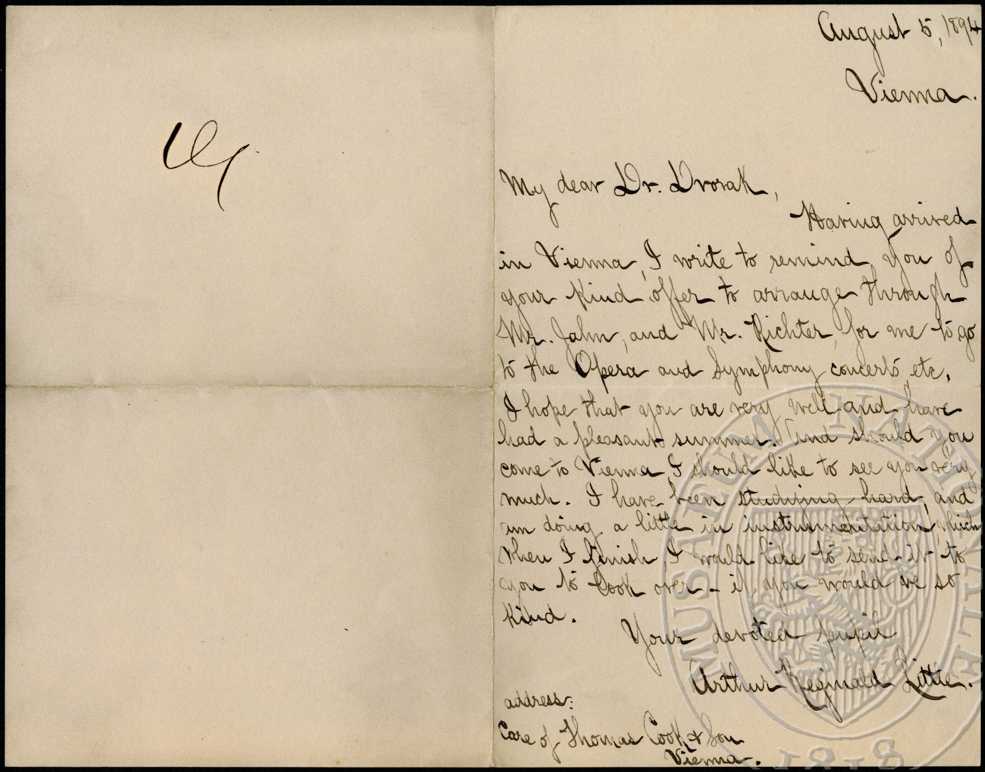 August 5, 1894 Vienna My dear Dr. Dvorak Having arrived in Vienna I write to remind you of your kind offer to arrange through Mr. John, and Mr. Richter, for one to go to the Opera and Symphony concerts etc. I hope that you are very well and have had a pleasant summer. And should you come to Vienna I should like to see you very much. I have been studying hard, and am doing a little in instrumentation which when I finish, I would like to send it to you to look over, if you would be so kind. Your devoted pupil Arthur Reginald Little Address: Care of Thomas Cook + Son Vienna.