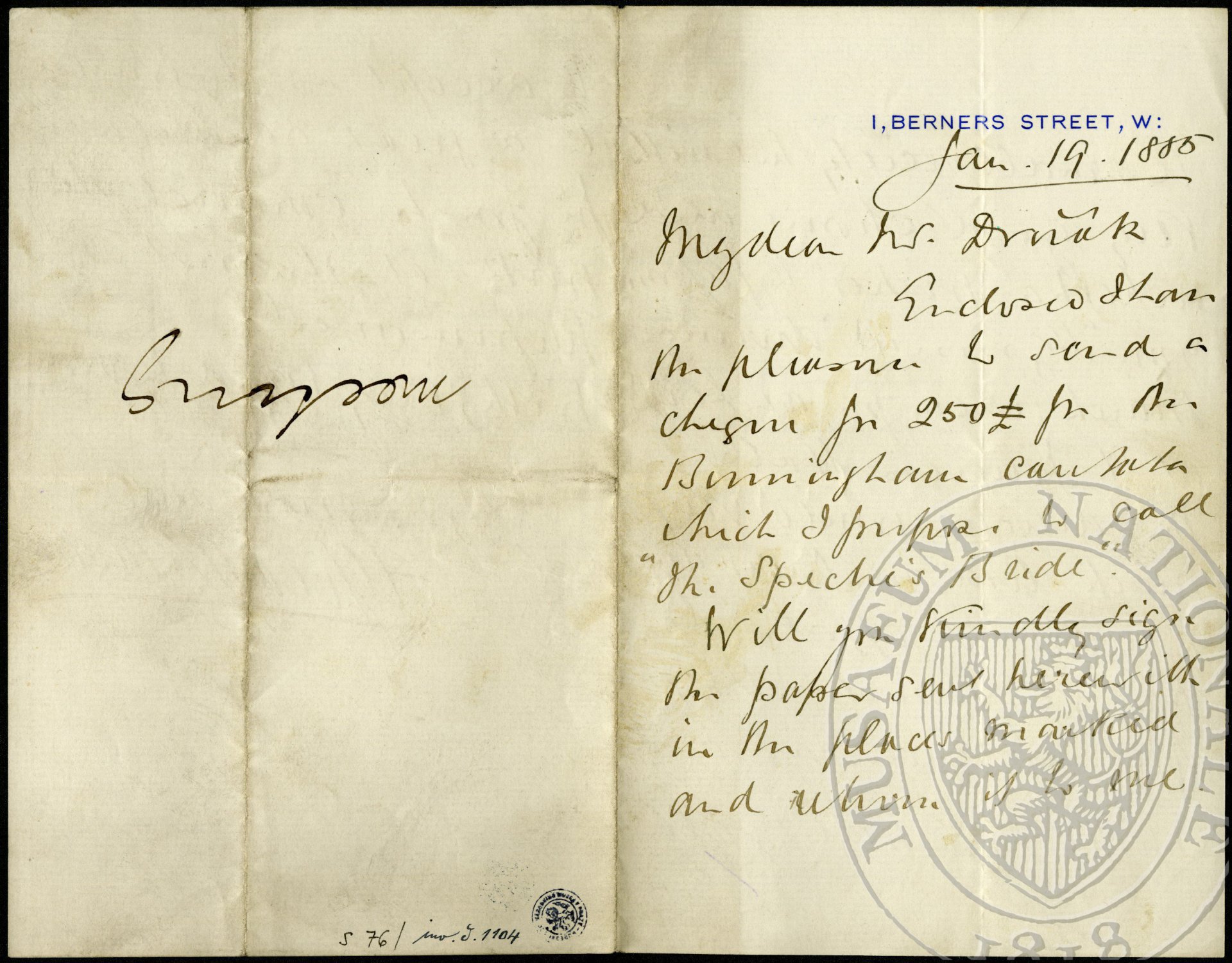 Jan 19. 1885 My dear Dr. Dvořák Enclosed I have the pleasure to send a cheque for 250£ for the Birmingham Cantata which I propose to call “The Spectre’s Bride”. Will you kindly sign the paper sent herewith in the places marked and return it to me. A small society but with very good chorus and orchestra wishes to perform your “Hymnus” during March (when you are here) at St. Francis Hall: the director would very much like you to conduct but cannot afford to pay very much: they offer ten guineas and I hope you will be able to accept as it would be a great advantage for you to conduct the work at its first performance. With very kind regards I am, Yours most sincerely Alfred Littleton