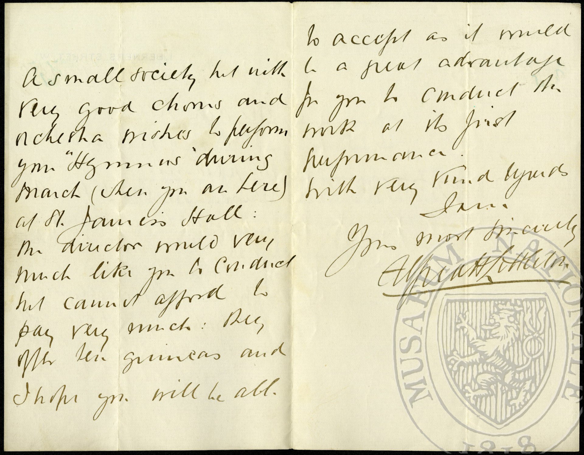 posílá šek na 250 liber za kantátu (Svatební košile), navrhuje pro ni název The Spectreś Bride, k možnosti provedení Hymnu, žádost o Dv.řízení