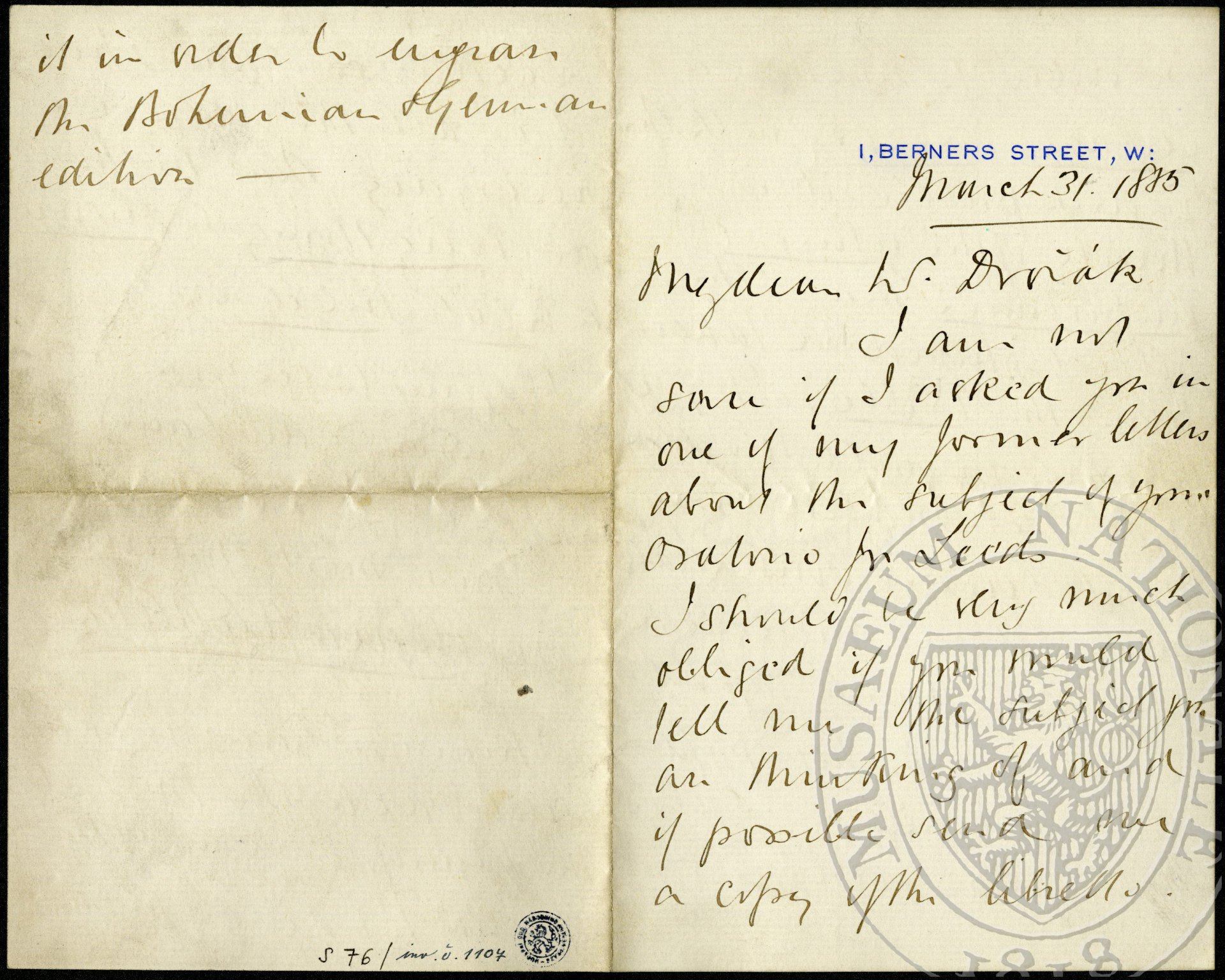 I hope you have already sent back the M[anu]S[cript] of the pianoforte score of the “Spectre’s Bride” as we want it in order to engrave the Bohemian + German edition.