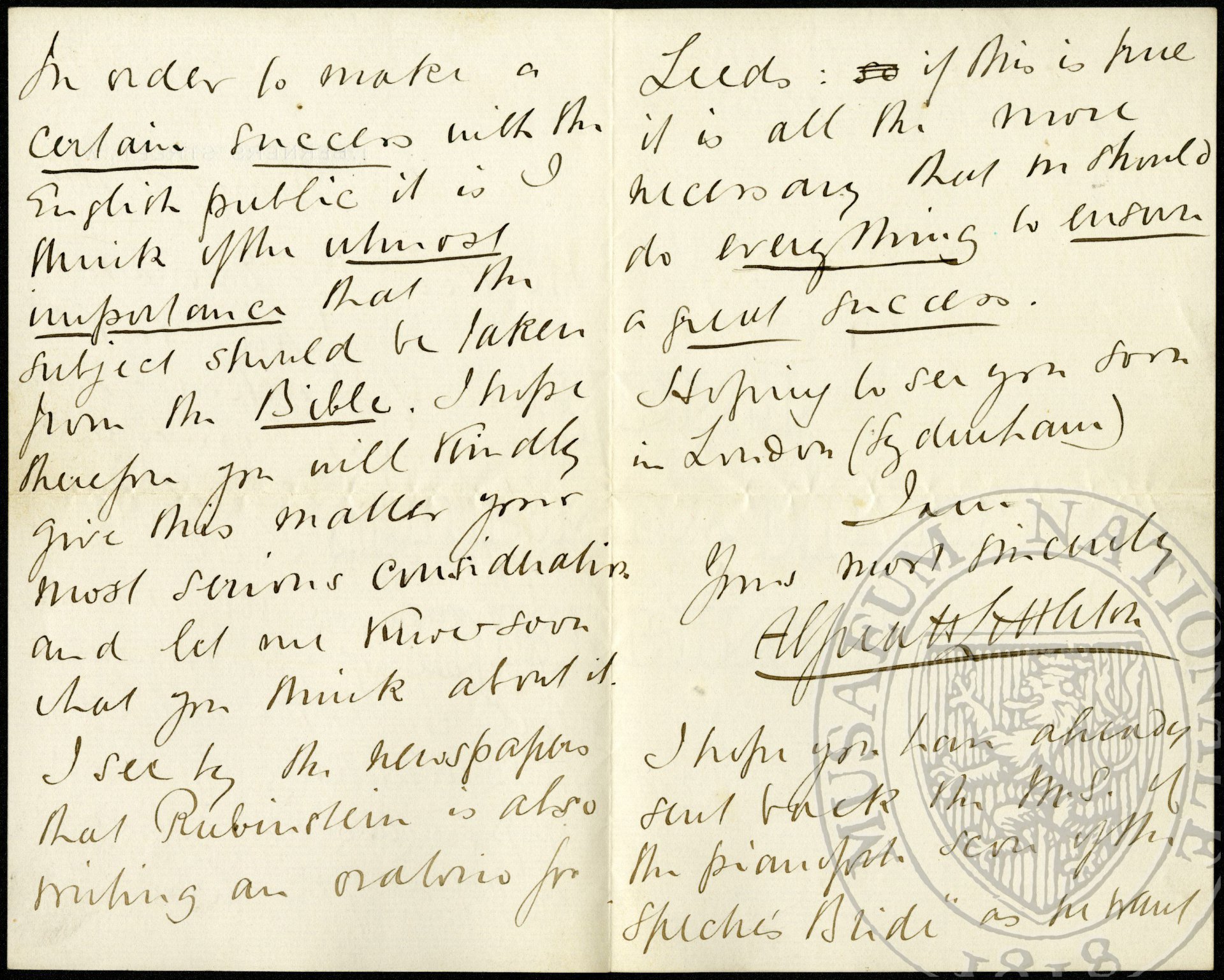 I should be very much obliged if you would tell me the subject you are thinking of and if possible send me a copy of the libretto. In order to make a certain success with the English public it is I think of the utmost importance that the subject should be taken from the Bible. I hope therefore you will kindly give this matter your most serious consideration and let me know soon what you think about it. I see by the newspapers that Rubinstein is also writing an oratorio for Leeds: so if this is true it is all the more necessary that we should do everything to ensure a great success.
