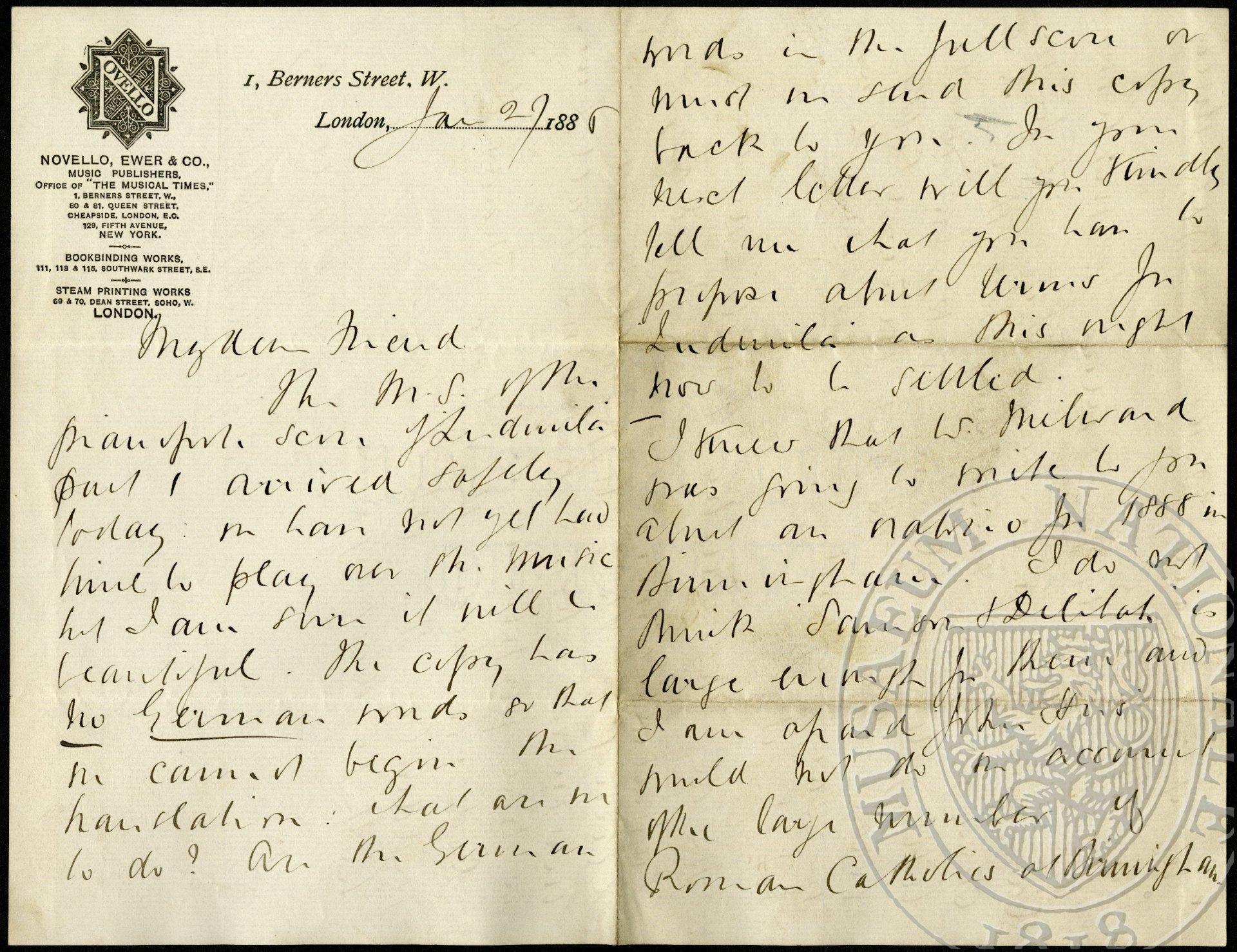 The M[anu]S[cript] of the pianoforte score of Ludmila part 1 arrived safely today: we have not yet had time to play over the music but I am sure it will be beautiful. The copy has no German words so that we cannot begin the translation : what are we to do? Are the German words in the full score or must we send this copy back to you. In your next letter will you kindly tell me what you have to propose about terms for Ludmila and this right now to be settled.