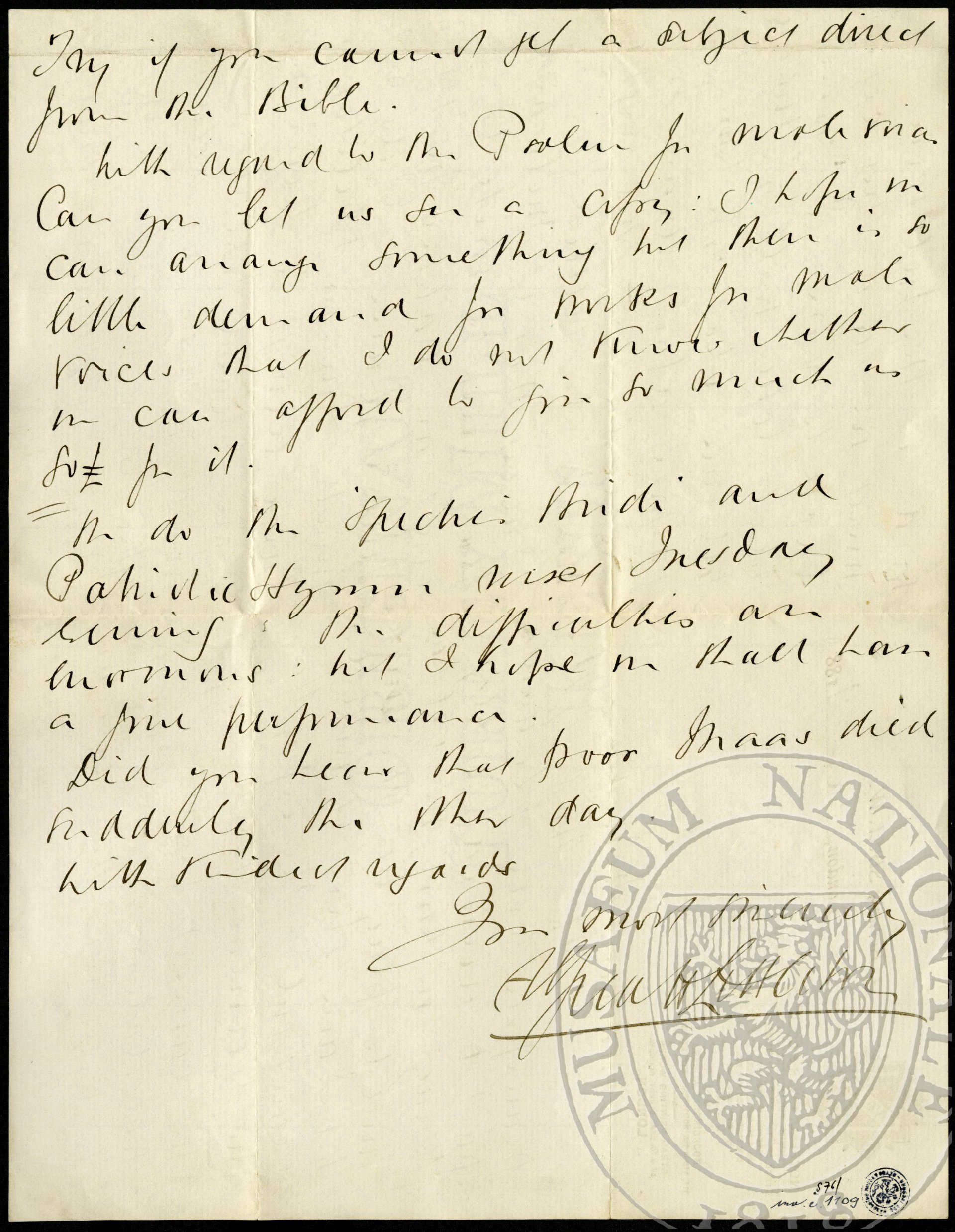 I knew that Mr. Milward was going to write to you about an oratorio for 1888 in Birmingham. I do not think ‘Samson + Delilah’ is large enough for them and I am afraid of this. This would not be on account of the large number of Roman Catholics at Birmingham. Say if you cannot yet a subject from the Bible.