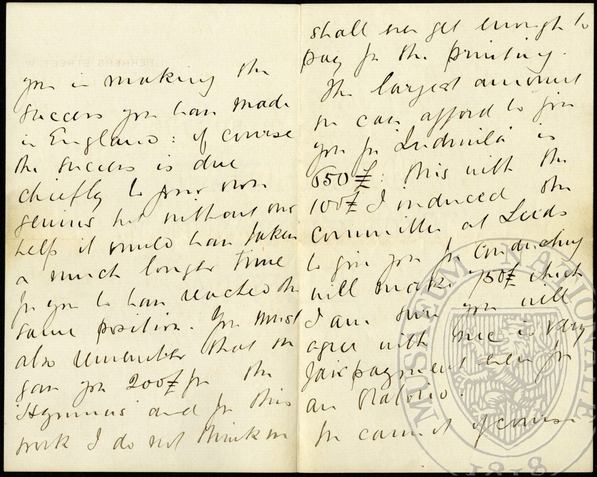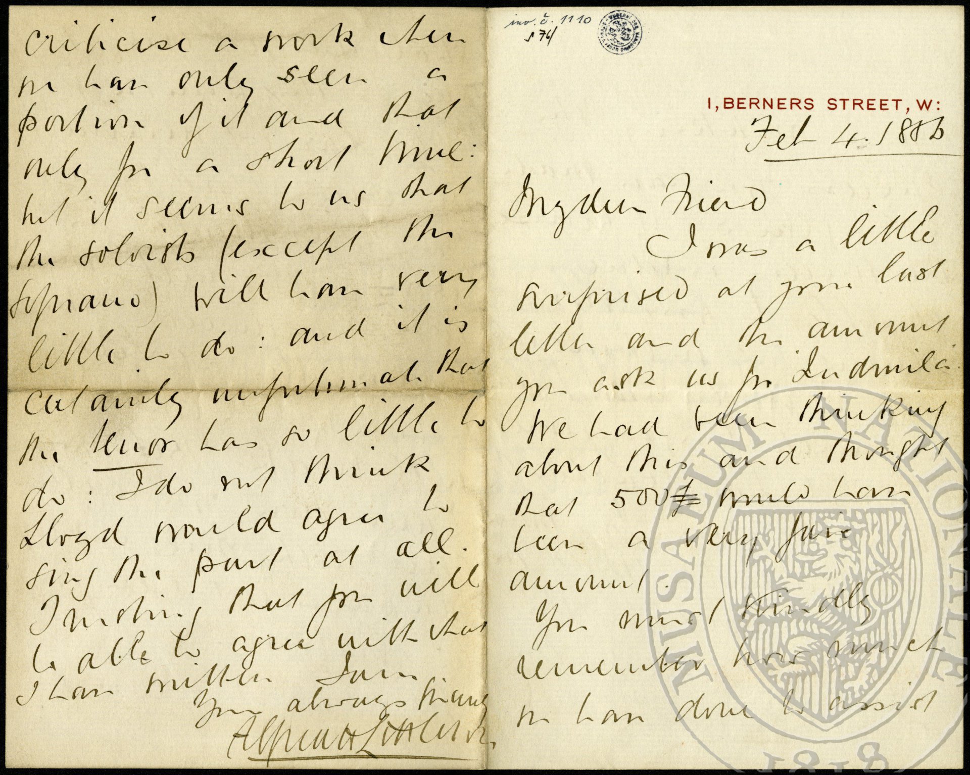 You must kindly remember how much we have done to assist you in making the success you have made in England: of course the success is due chiefly to your own genius but without our help it would have taken a much longer time for you to have reached the same position. You must also remember that we gave you 200 £. For the “Hymnus” and for this work I do not think we shall even get enough to pay for the printing. The largest amount we can afford to give you for “Ludmila” is 650 £: this with the 100 £. I induced the committee at Leeds to give you for conducting will make 750 £ which I am sure you will agree with me is [a] very fair payment even for an oratorio.
