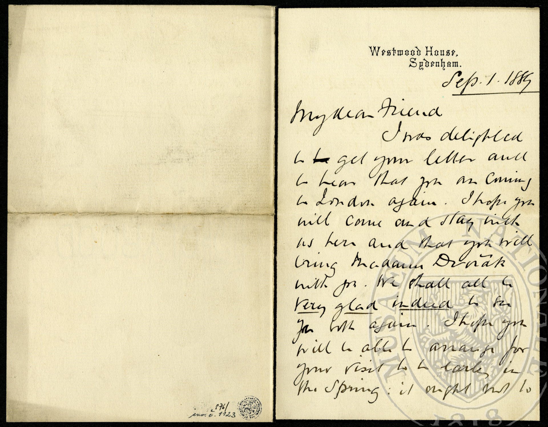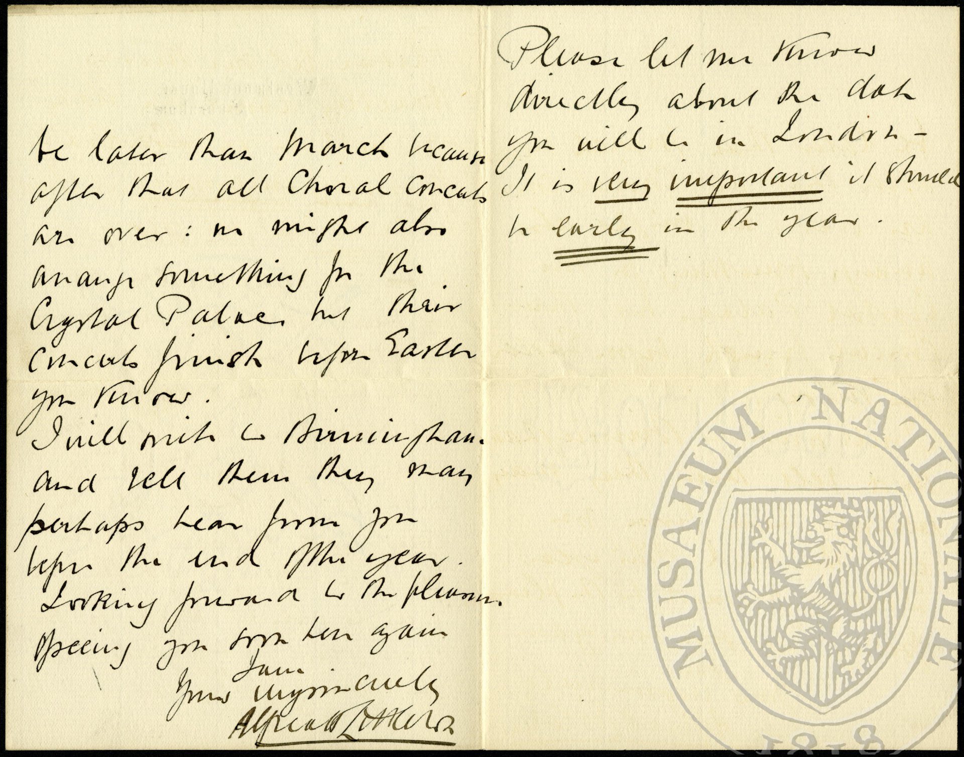 I was delighted to be get your letter and to hear that you are coming to London again. I hope you will come and stay with us here and that you will bring Madame Dvořák with you. We shall all be very glad indeed to see you both again. I hope you will be able to arrange for your visit to be early in the spring: it ought not to be later than March because after that all choral concerts are over: we might also arrange something for the Crystal Palace but their concerts finish before Easter you know.