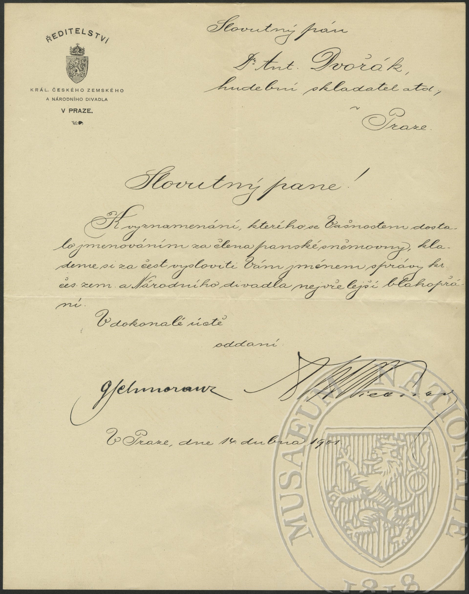Ředitelství Národního divadla v Praze Dvořák Antonín