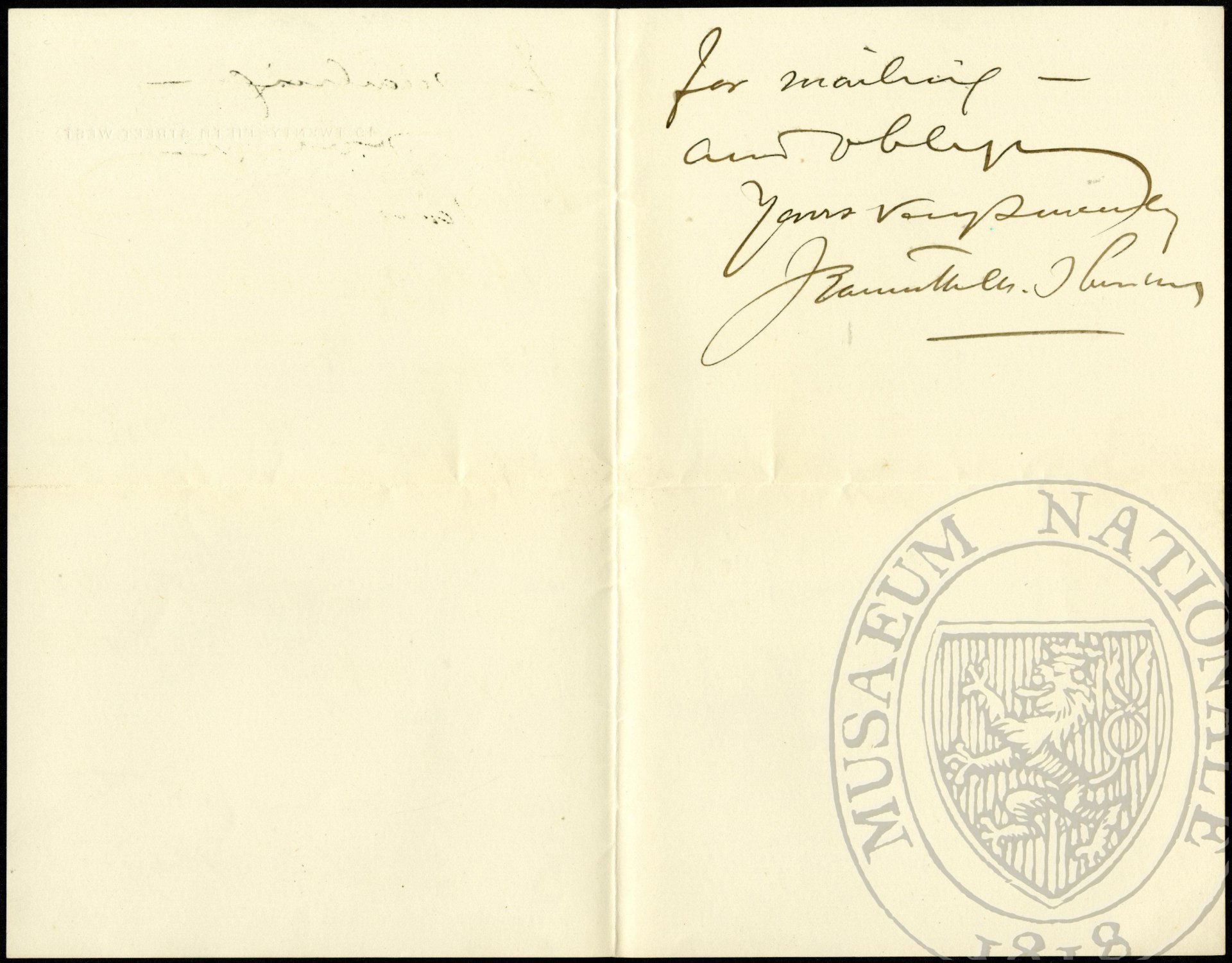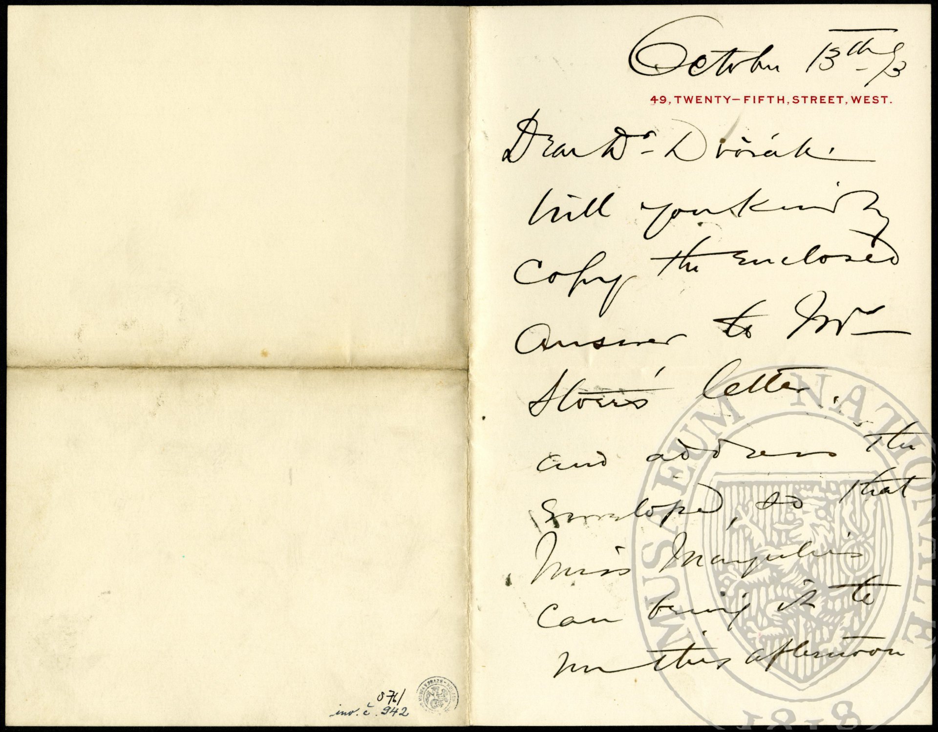 October 13th, 93 Dear Dr. Dvořák, Will you kindly copy the enclosed answer to Mr. Al[ois?] letter and address the envelope so that Miss Margulies can bring it to him this afternoon for mailing and oblige. Yours very sincerely, Jeanette M. Thurber