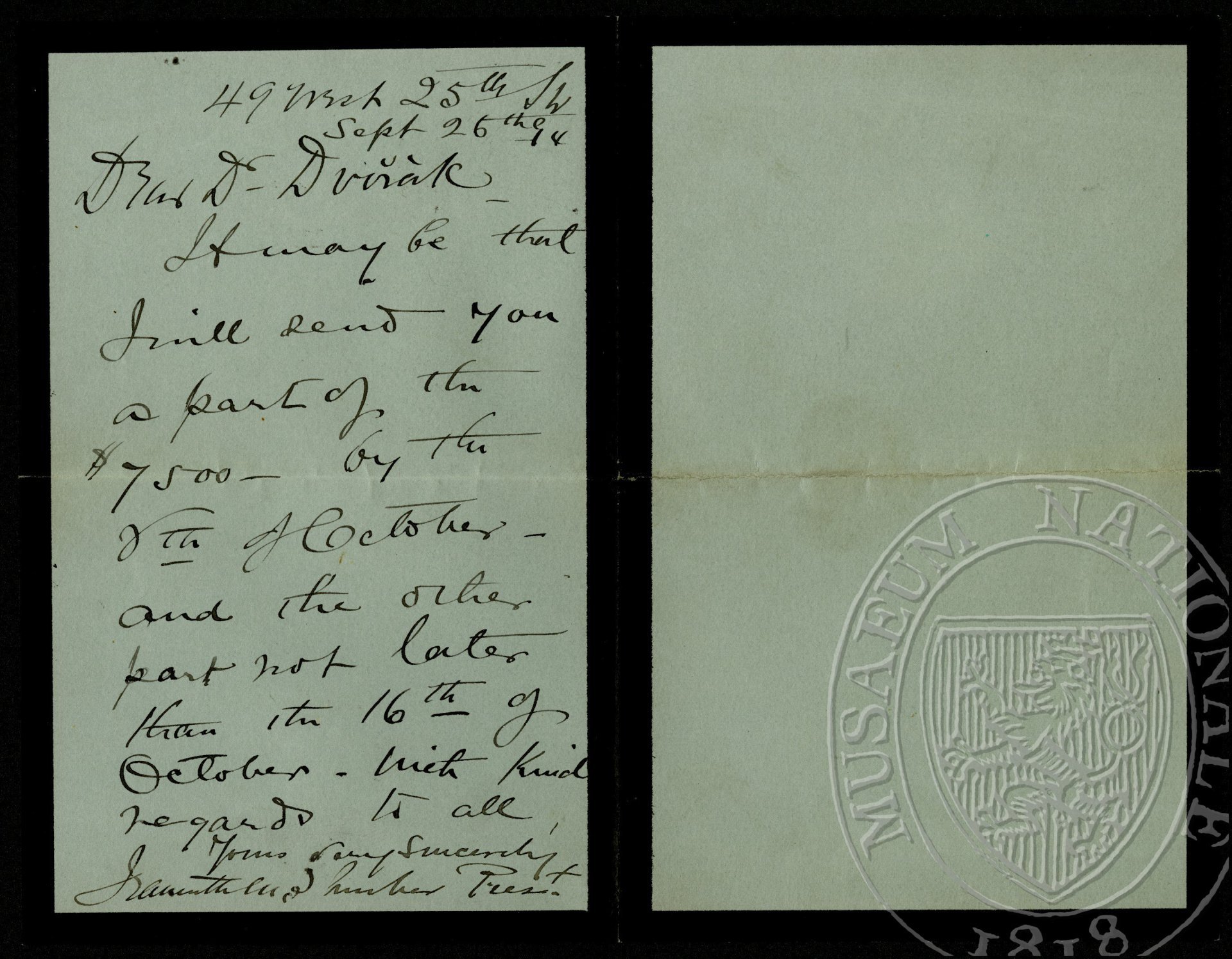 Dear Dr Dvořák It may be that I will send you a part of the $7500 - by the 6th of October and the other part not later than the 16th of October. With kind regards to all. Yours very sincerely, Jeanette M Thurber Pres[ident]