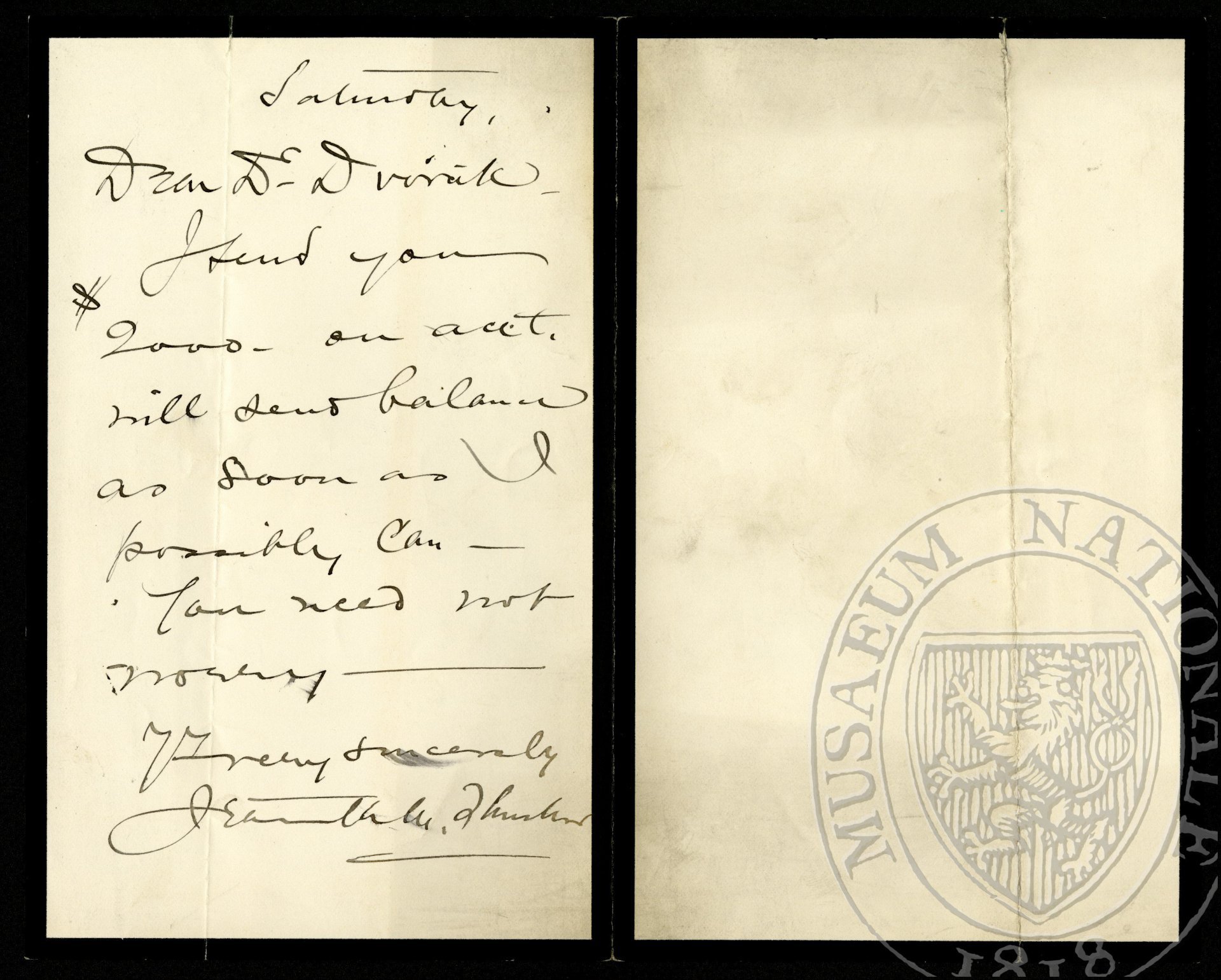 I send you $2000. On acct.[ount] Will send balance as soon as I possibly can. You need not worry.