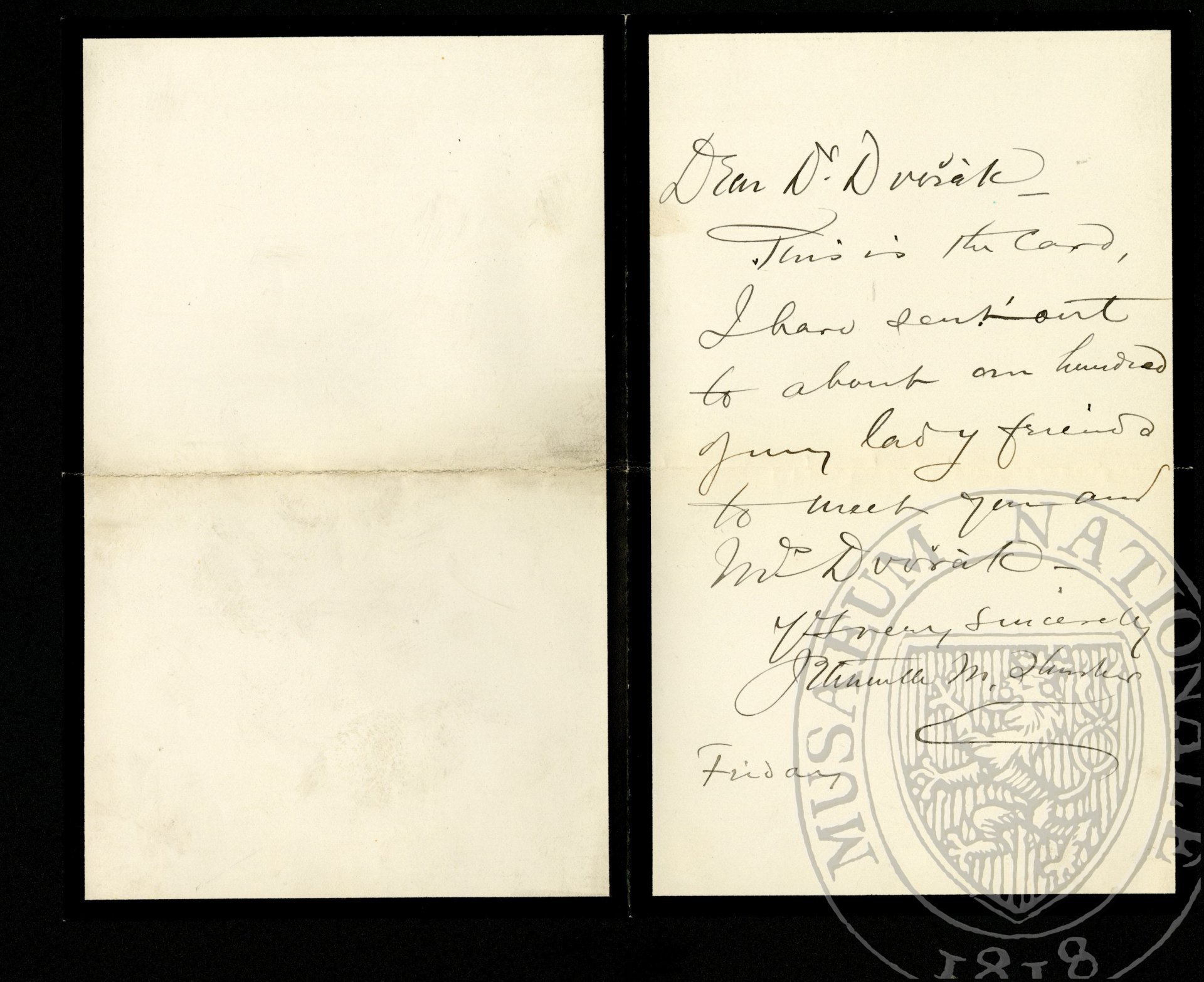 This is the card I have sent out to about one hundred of my lady friends to meet you and Mrs. Dvořák.