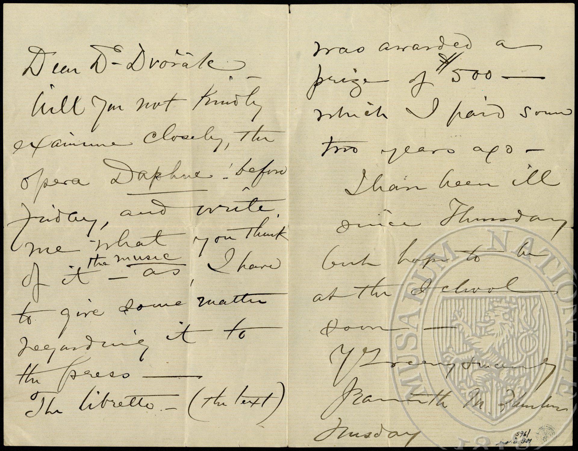 Will you not kindly examine closely the opera Daphne before Friday, and write me what you think of it - the music - as I have to give some matter regarding it to the press. The libretto (the text) was awarded a prize of $500 which I paid some two years ago.