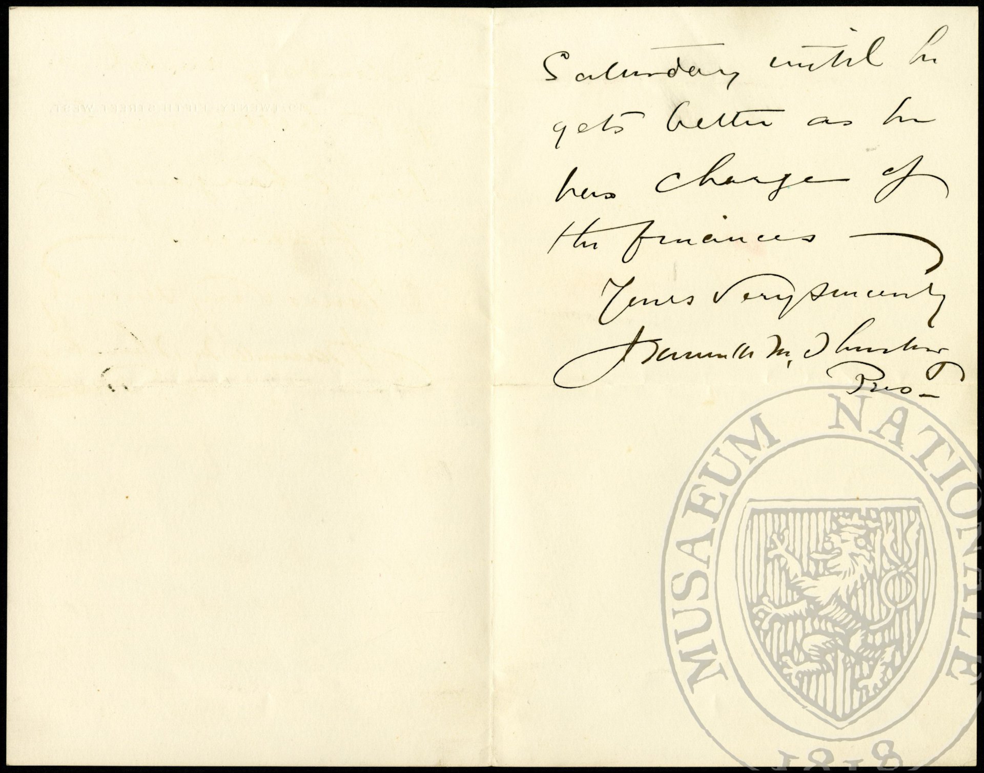 I have just been notified that our cashier, Mr. Field, is very ill, with typhoid fever, so I will be obliged to ask you to wait for the amount which was to have been paid to you Saturday until he gets better as he has charge of the finances.