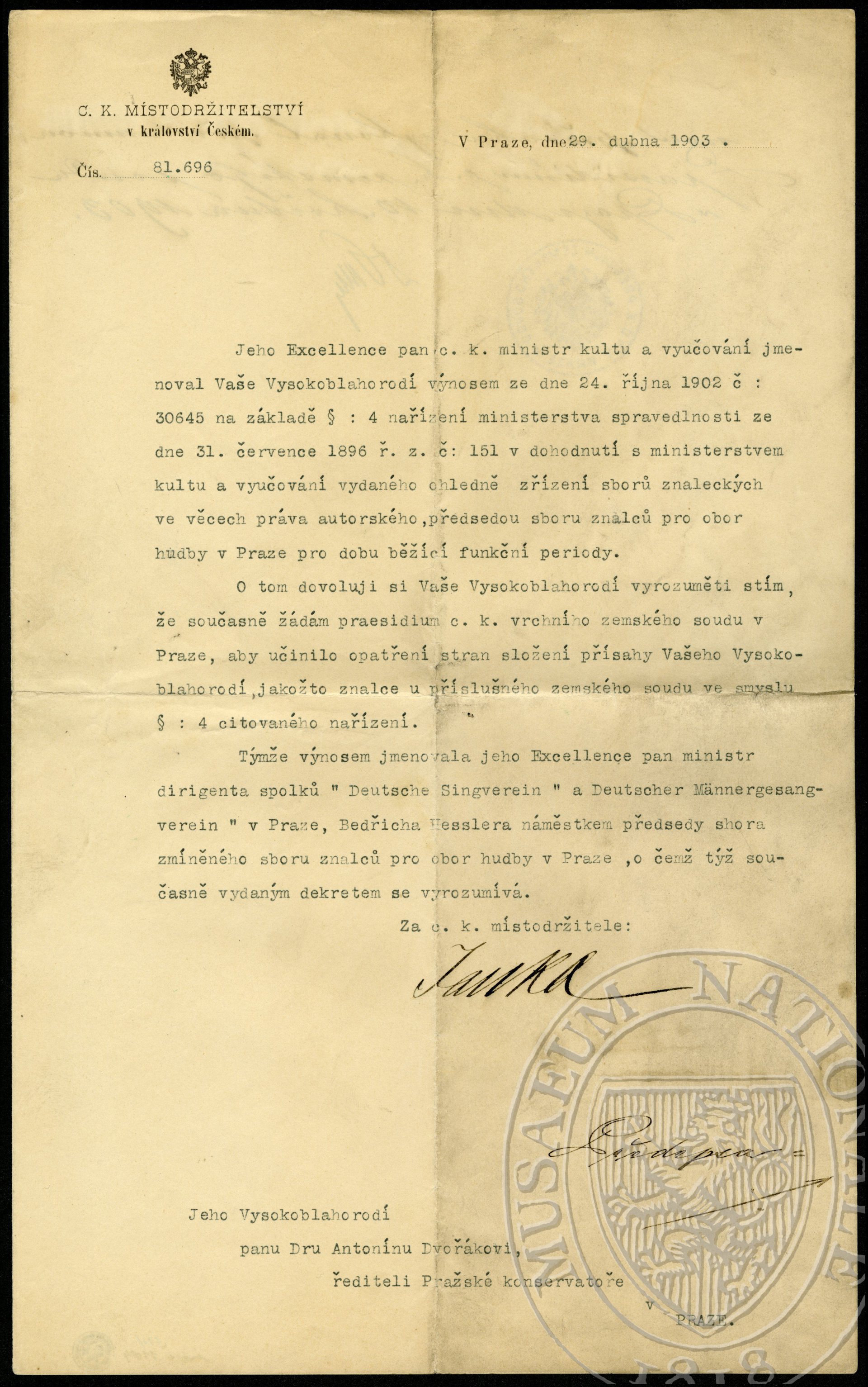 C.k. Místodržitelství v království Českém Dvořák, Antonín