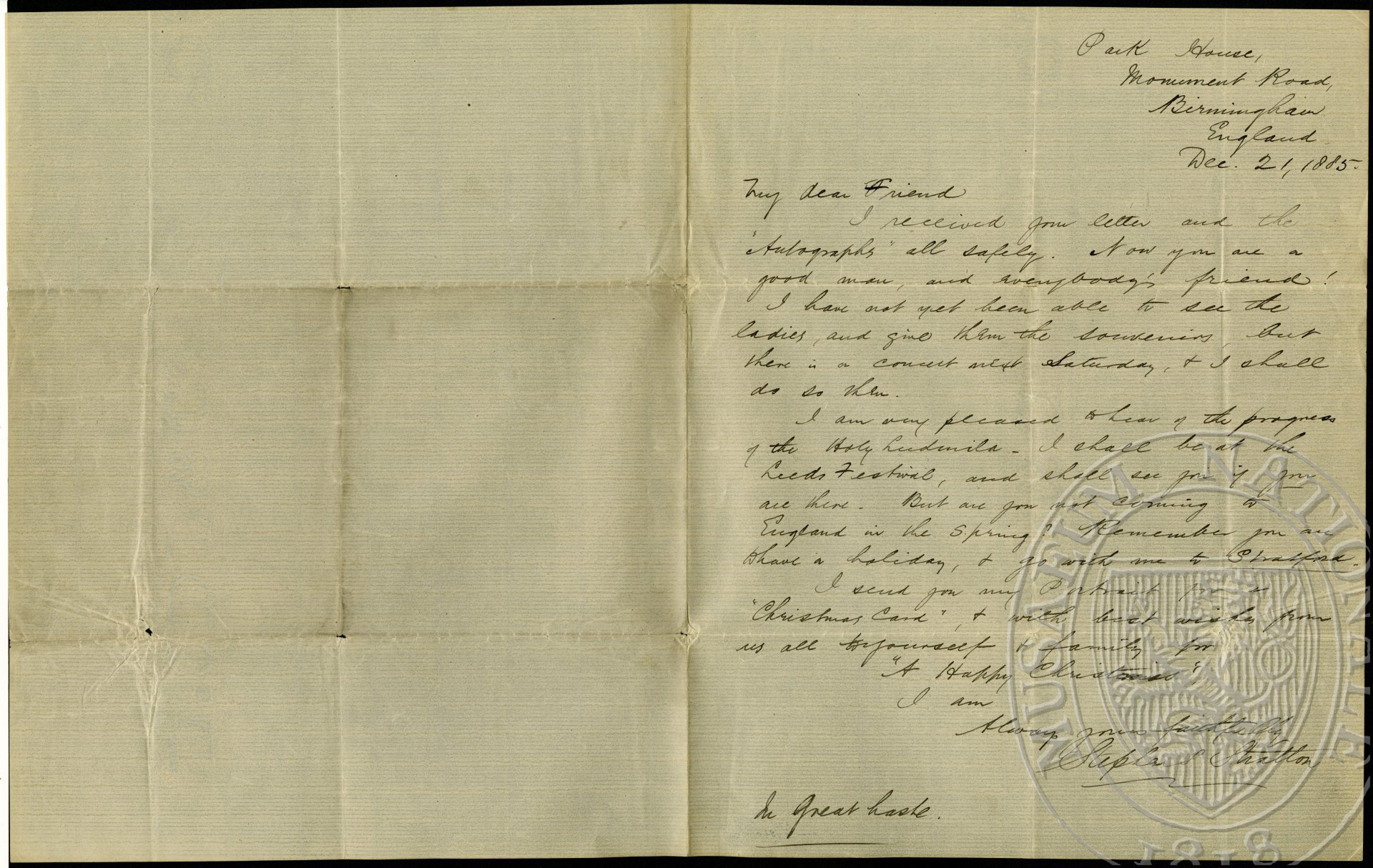 I am very pleased to hear of the progress of the Holy Ludmila. I shall be at the Leeds Festival, and shall see you if you are there. But are you not coming to England in the spring? Remember you are to have a holiday, + go with me to Stratford.